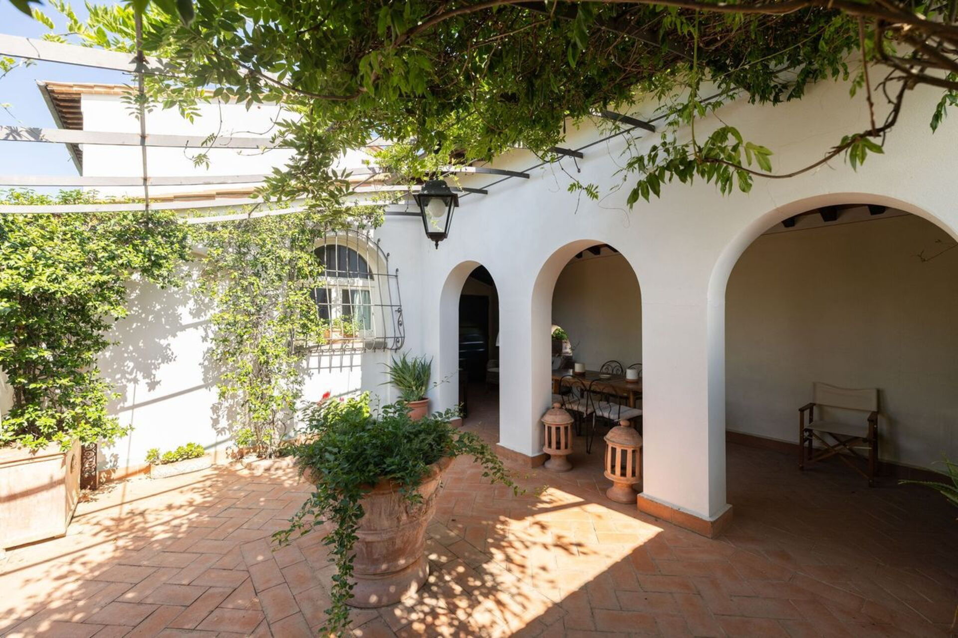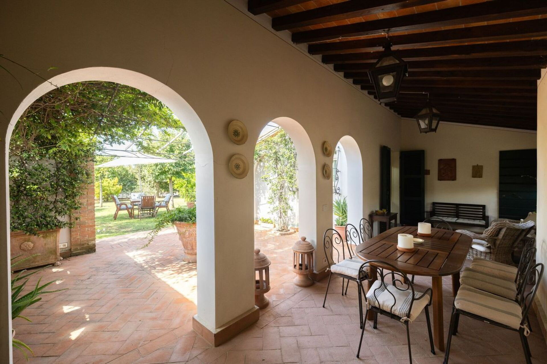 Patio: dineren in de buitenlucht, eettafel, tuinmeubilair.