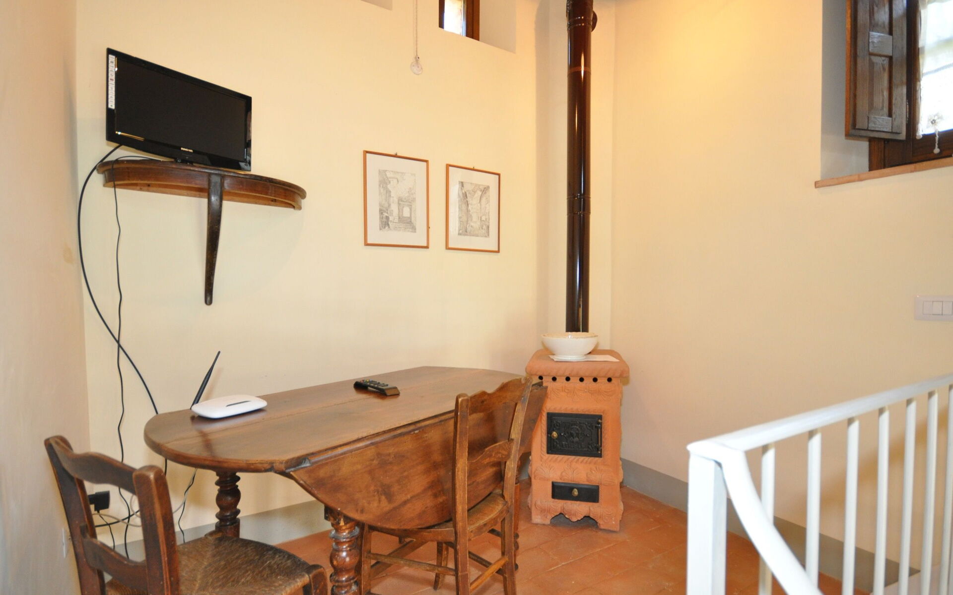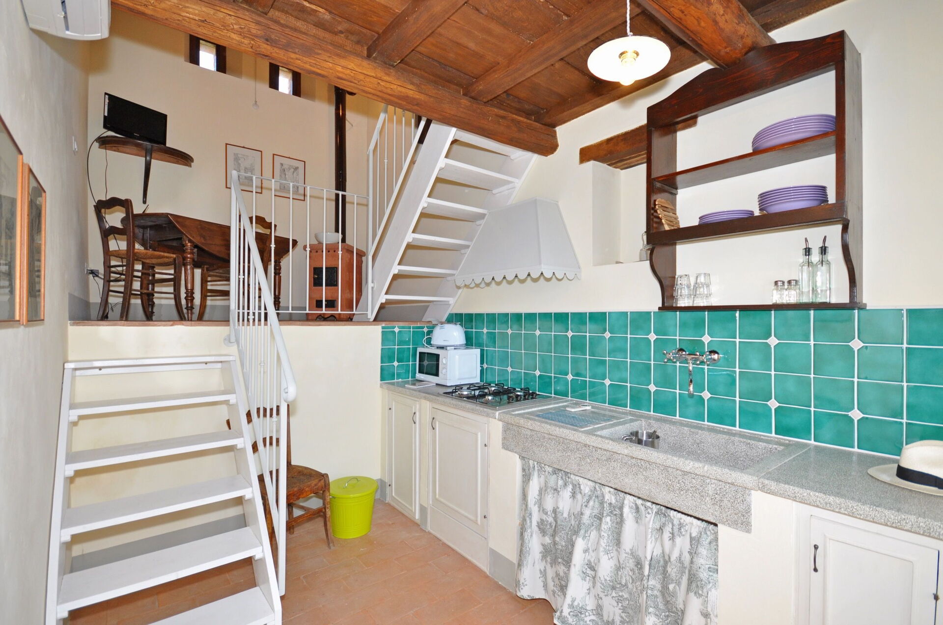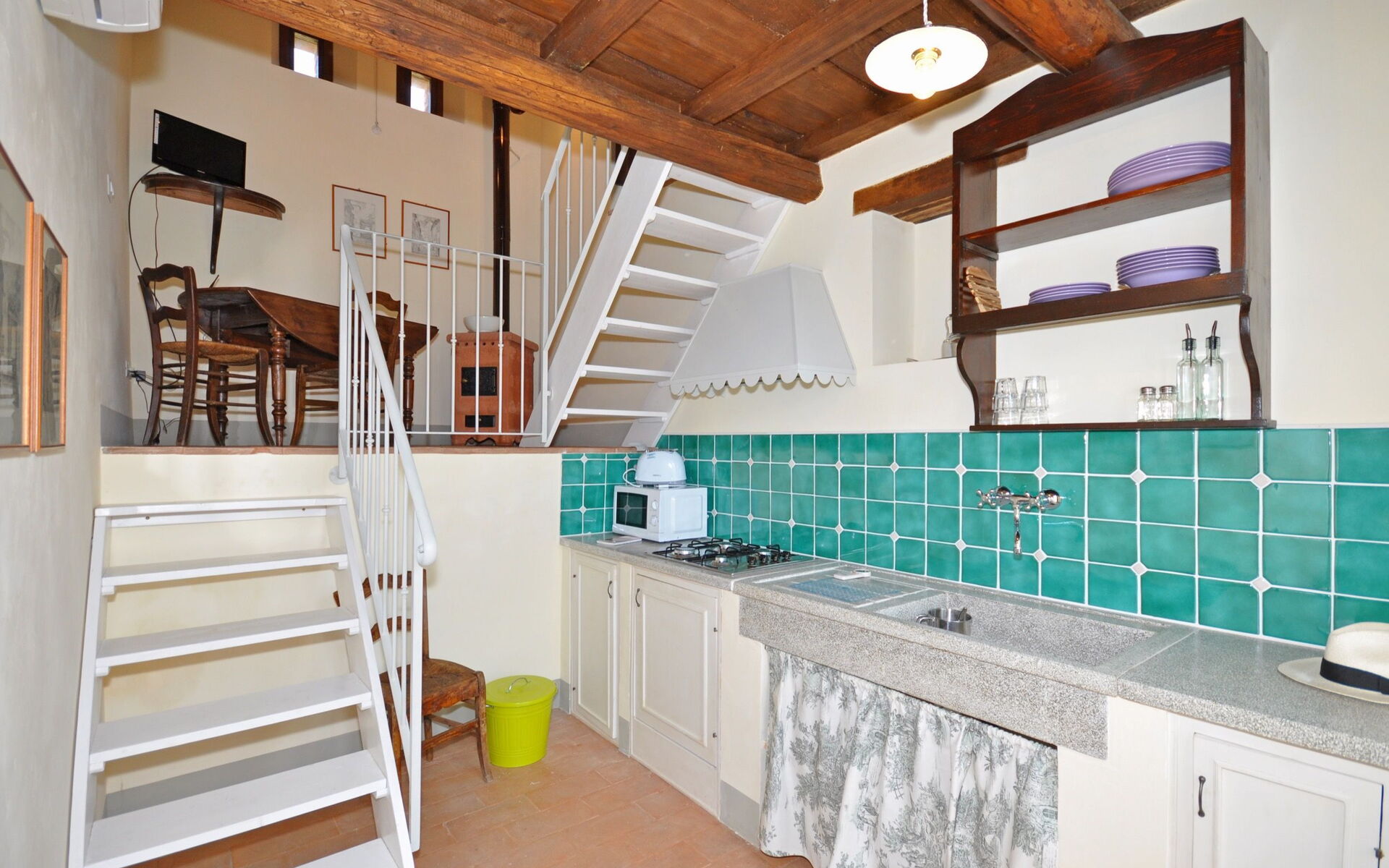 Enkele treden hoger: Een open galerij die uitkijk op de keuken en eetkamer met een eenpersoonsbed.