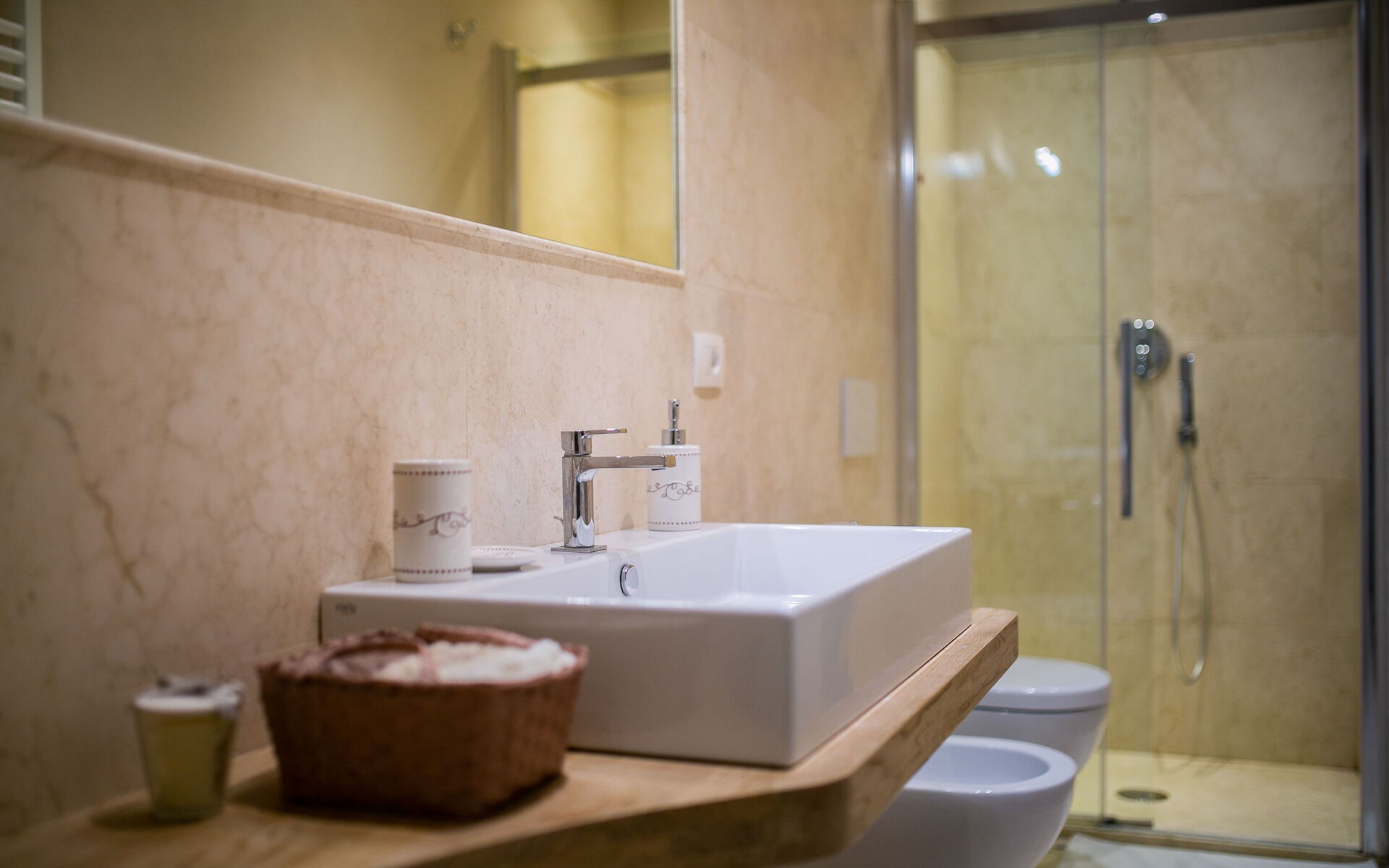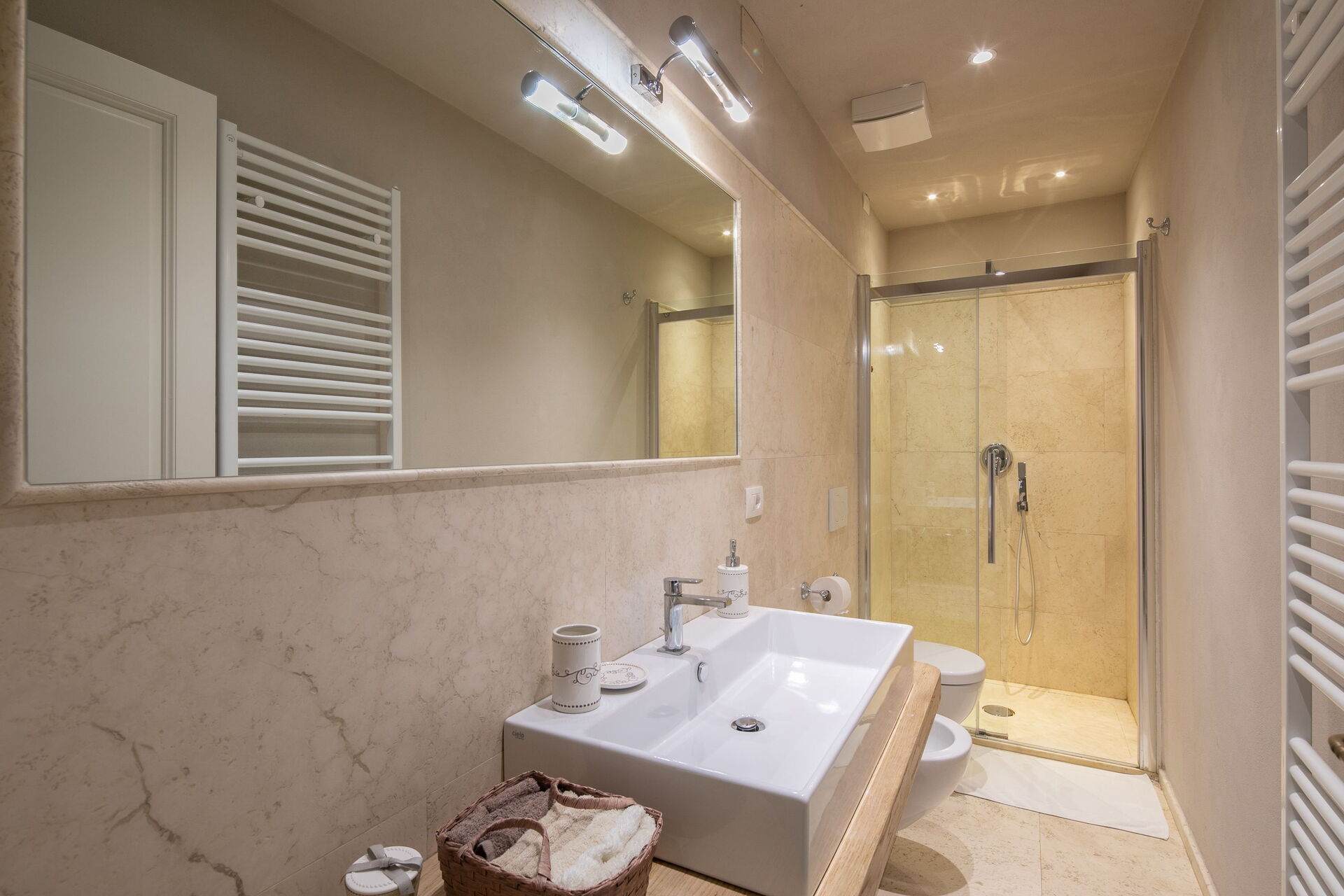Badkamer: wastafel, toilet , bidet, douche.
