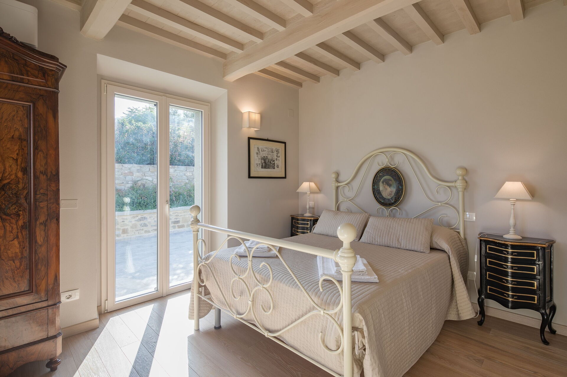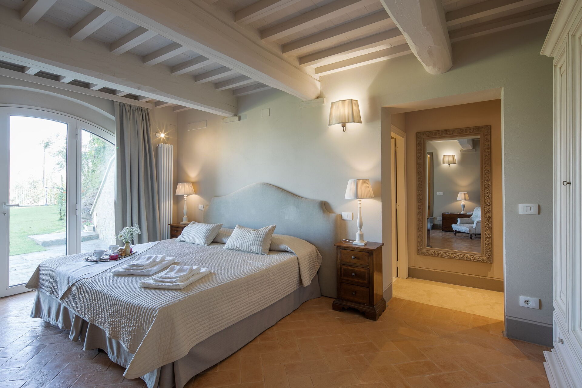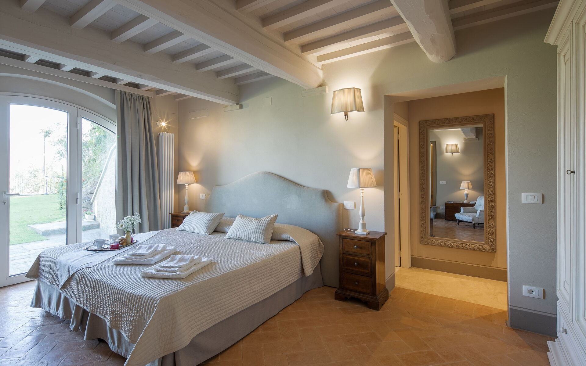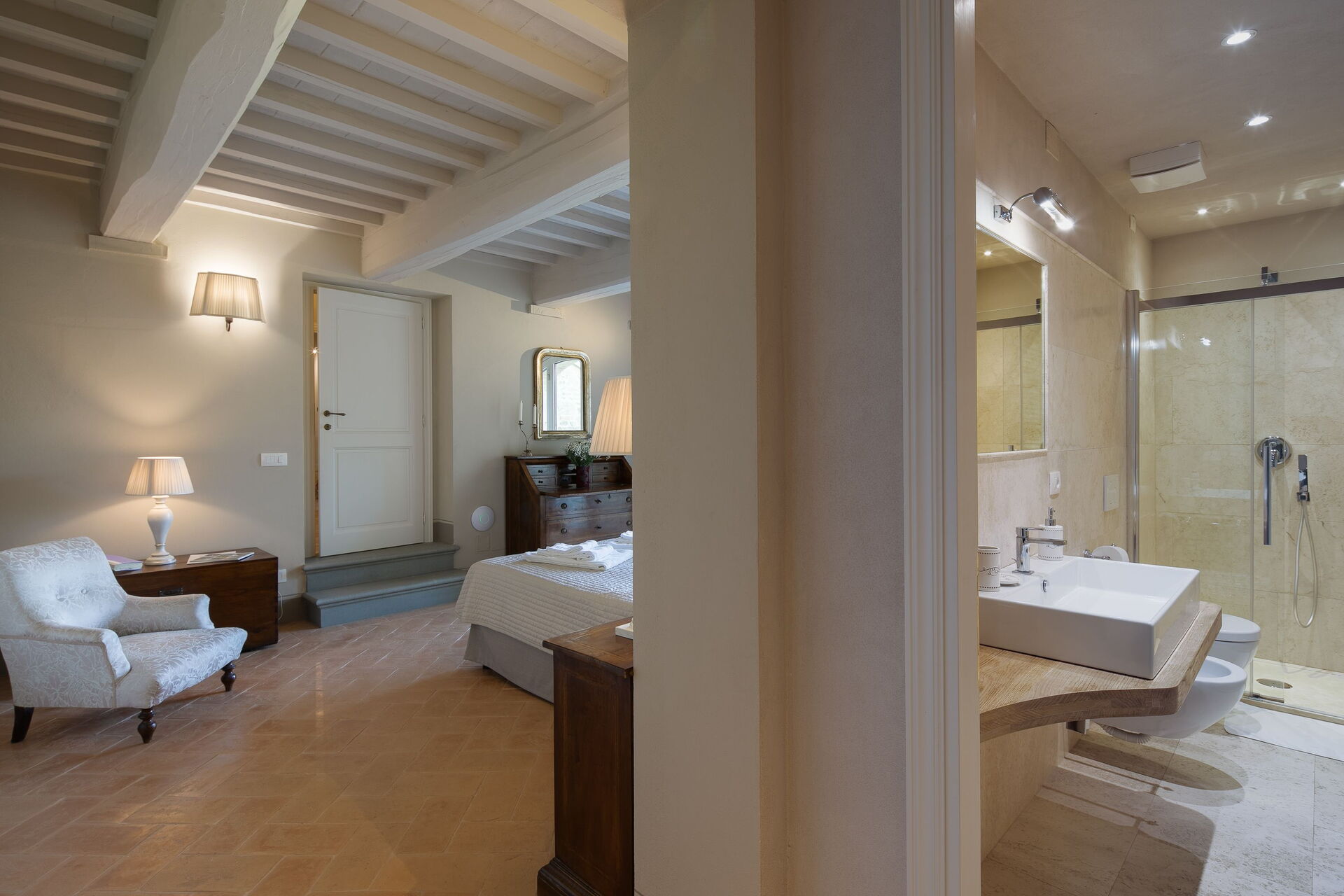 Slaapkamer met badkamer: king size bed, hor, wastafel, toilet , bidet, douche, uitgang naar de tuin.