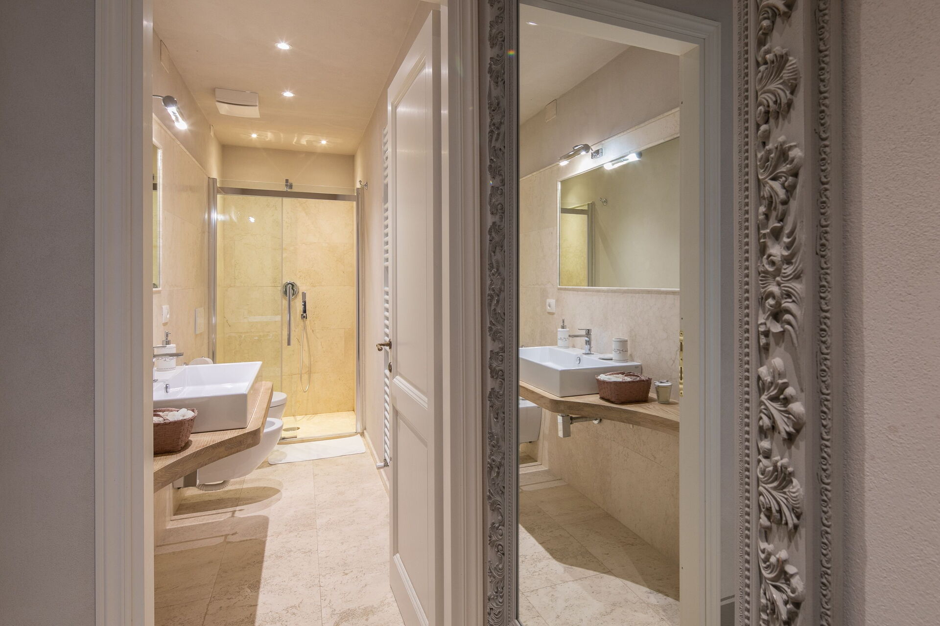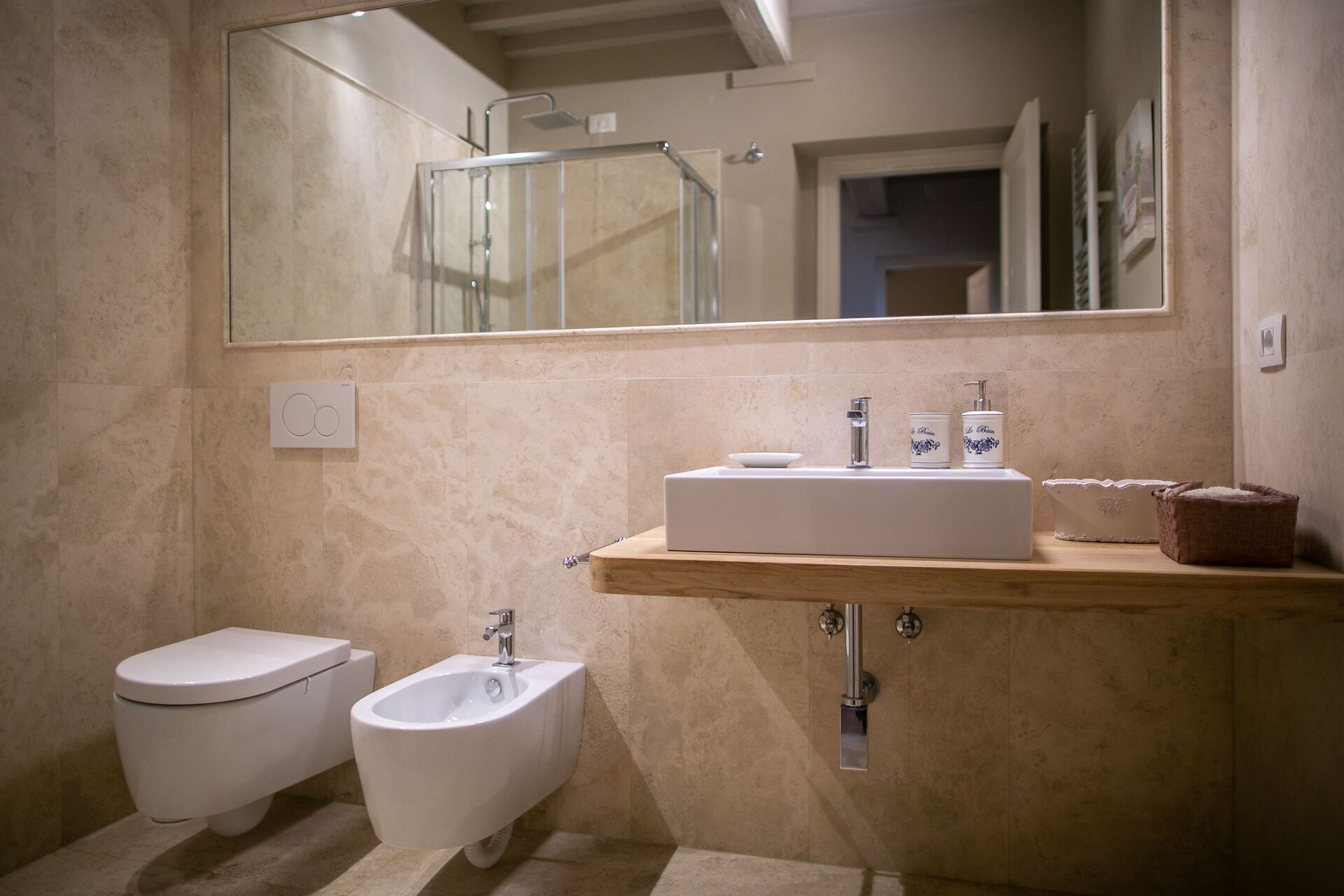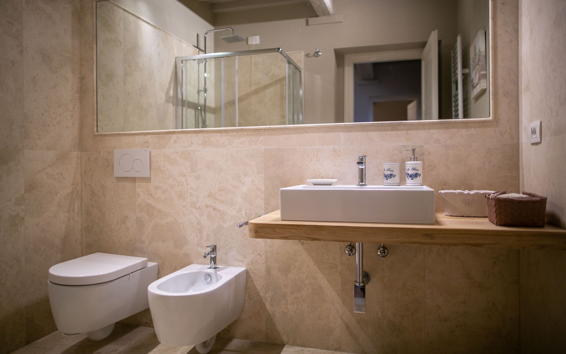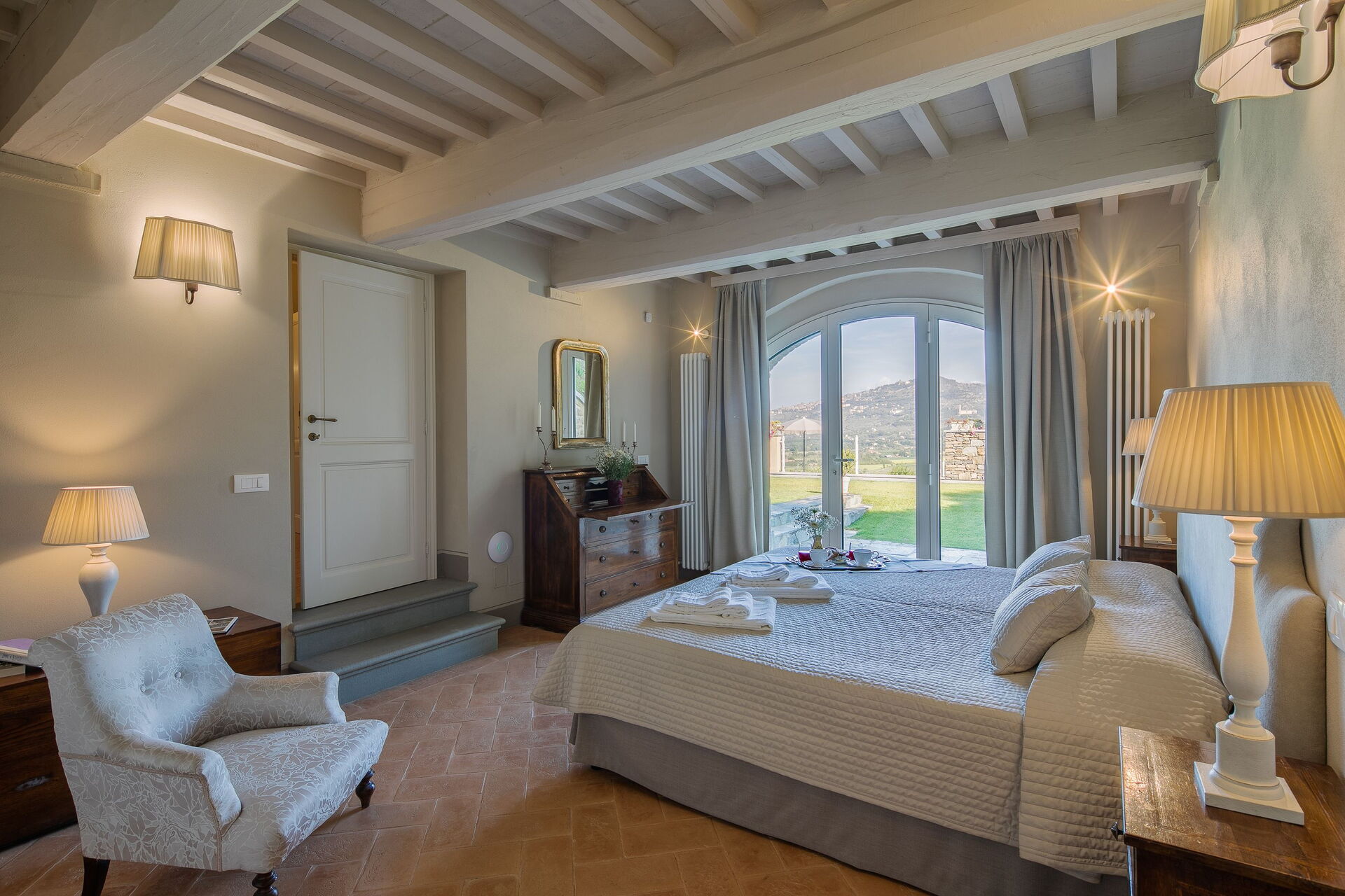 Slaapkamer met badkamer: king size bed, hor, wastafel, toilet , bidet, douche, uitgang naar de tuin.