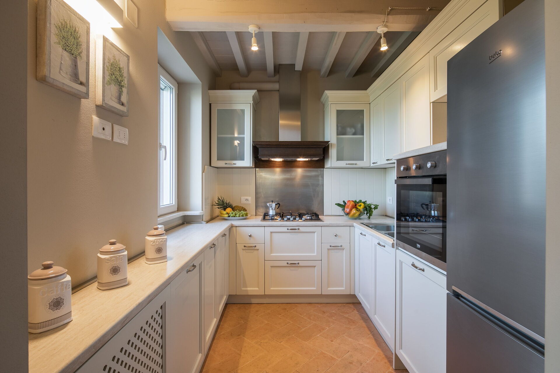 Keuken: goed uitgeruste keuken, vaatwasser, ijskast, diepvriezer, kookplaat, oven, broodrooster, italiaans koffiezetapparaat, koffiezetapparaat, WIFI internet, uitgang naar de tuin.