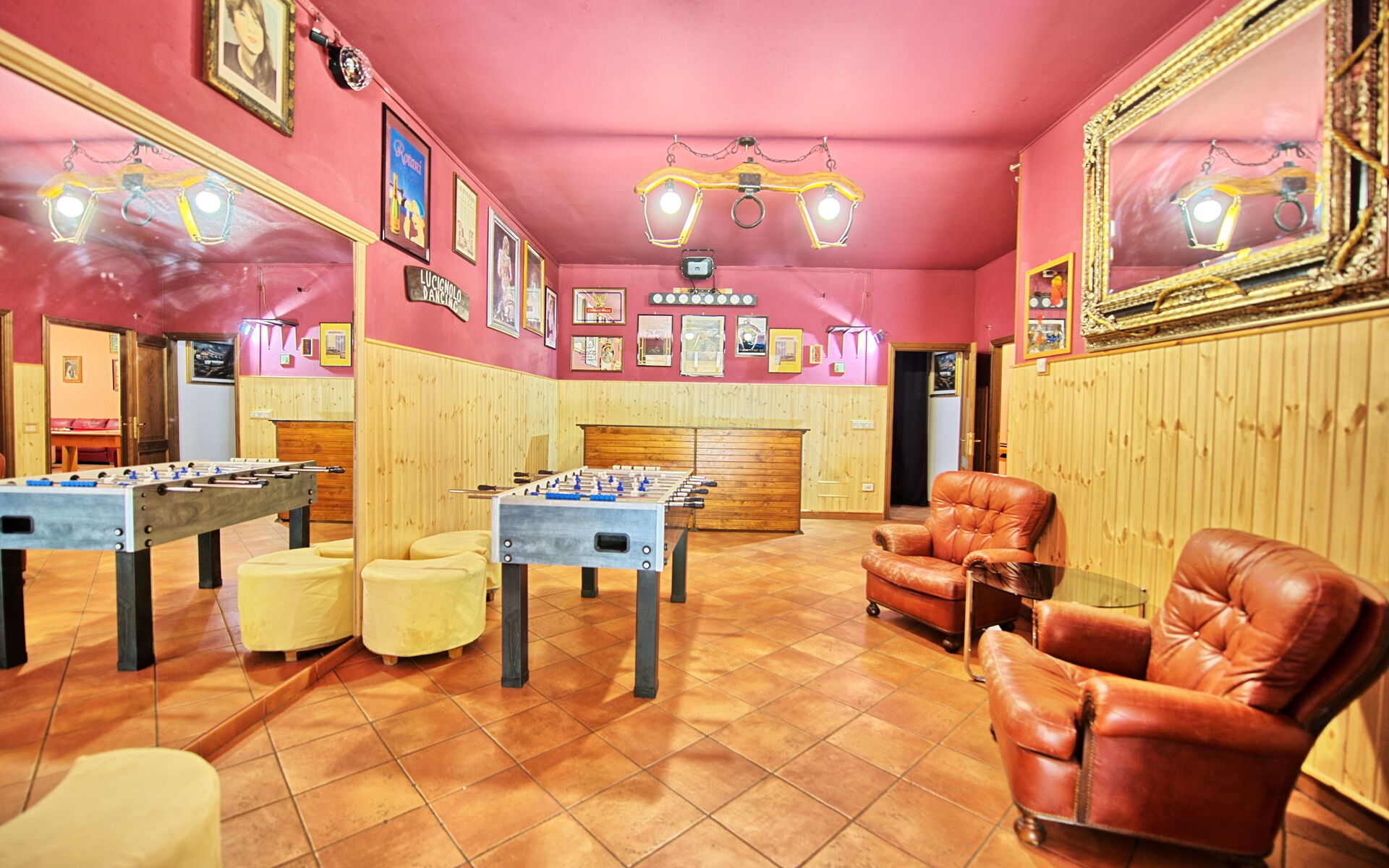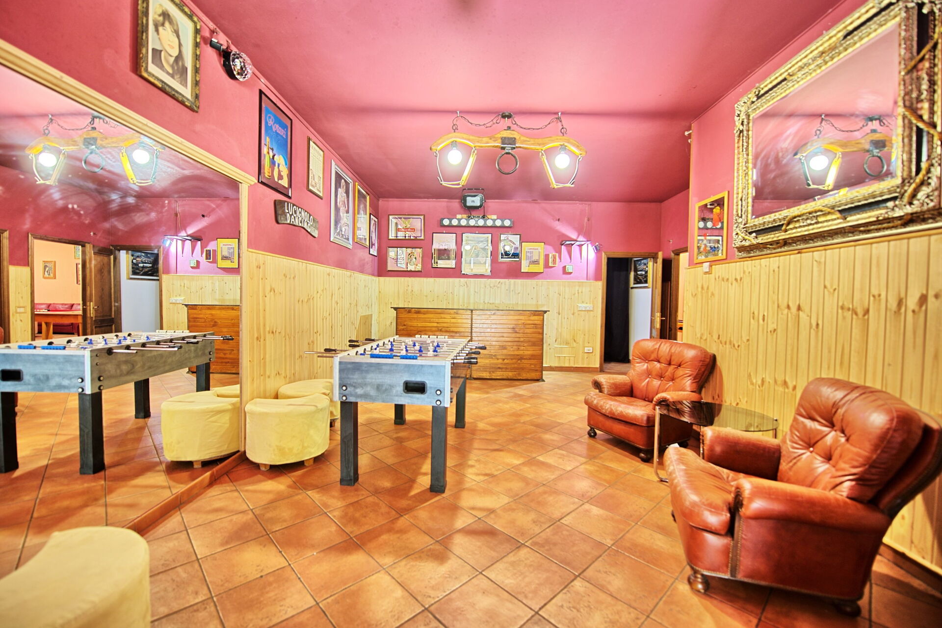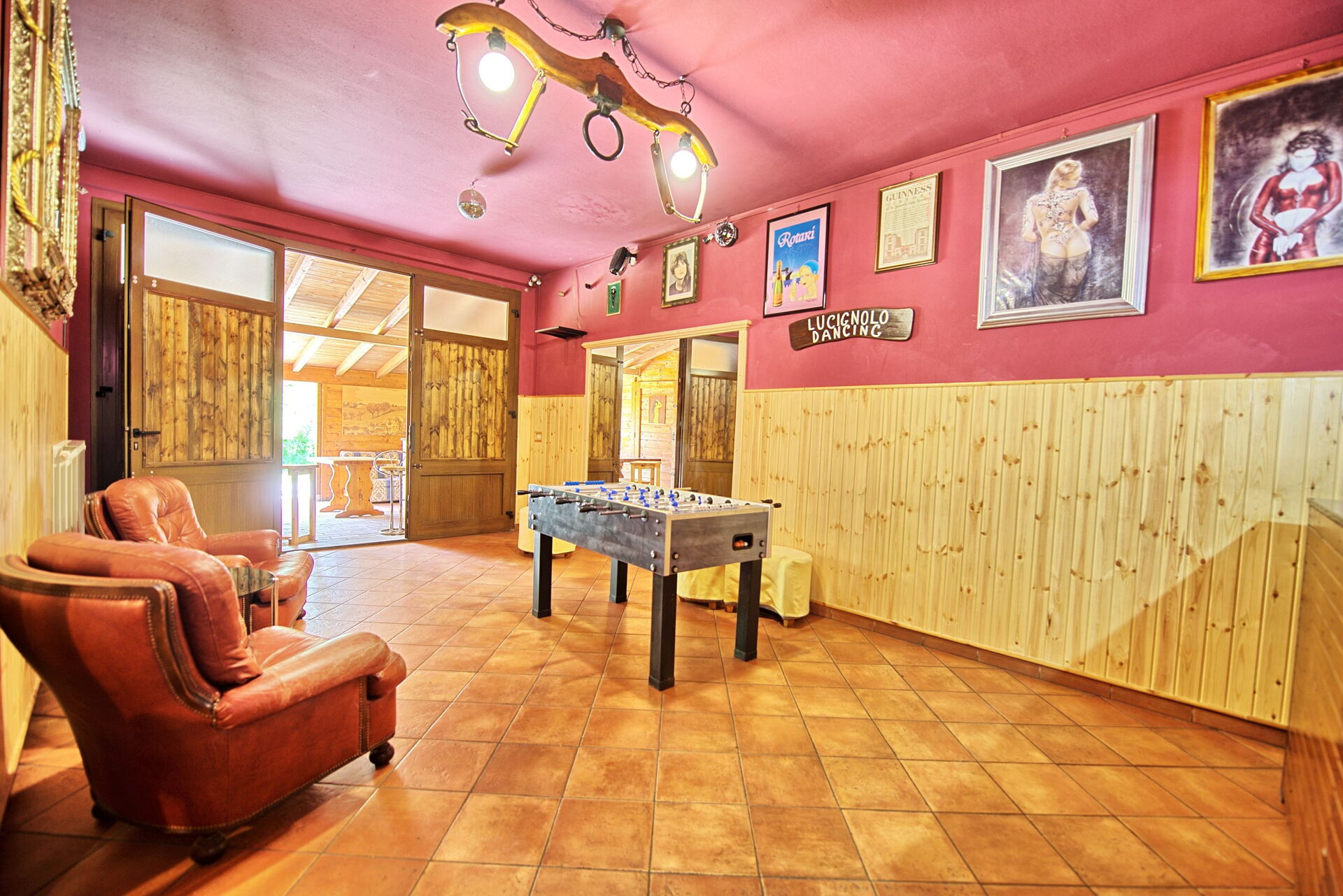 Lager gelegen verdieping(ook van buiten af op tuinniveau toegankelijk): grote ruimte met stereo installatie en disco verlichting, kamer met slaapbanken, biljarttafel(pool), slaapkamer met tweepersoonsbed, slaapkamer met tweepersoonsbed, badkamer met douche, wasruimte met wasmachine.