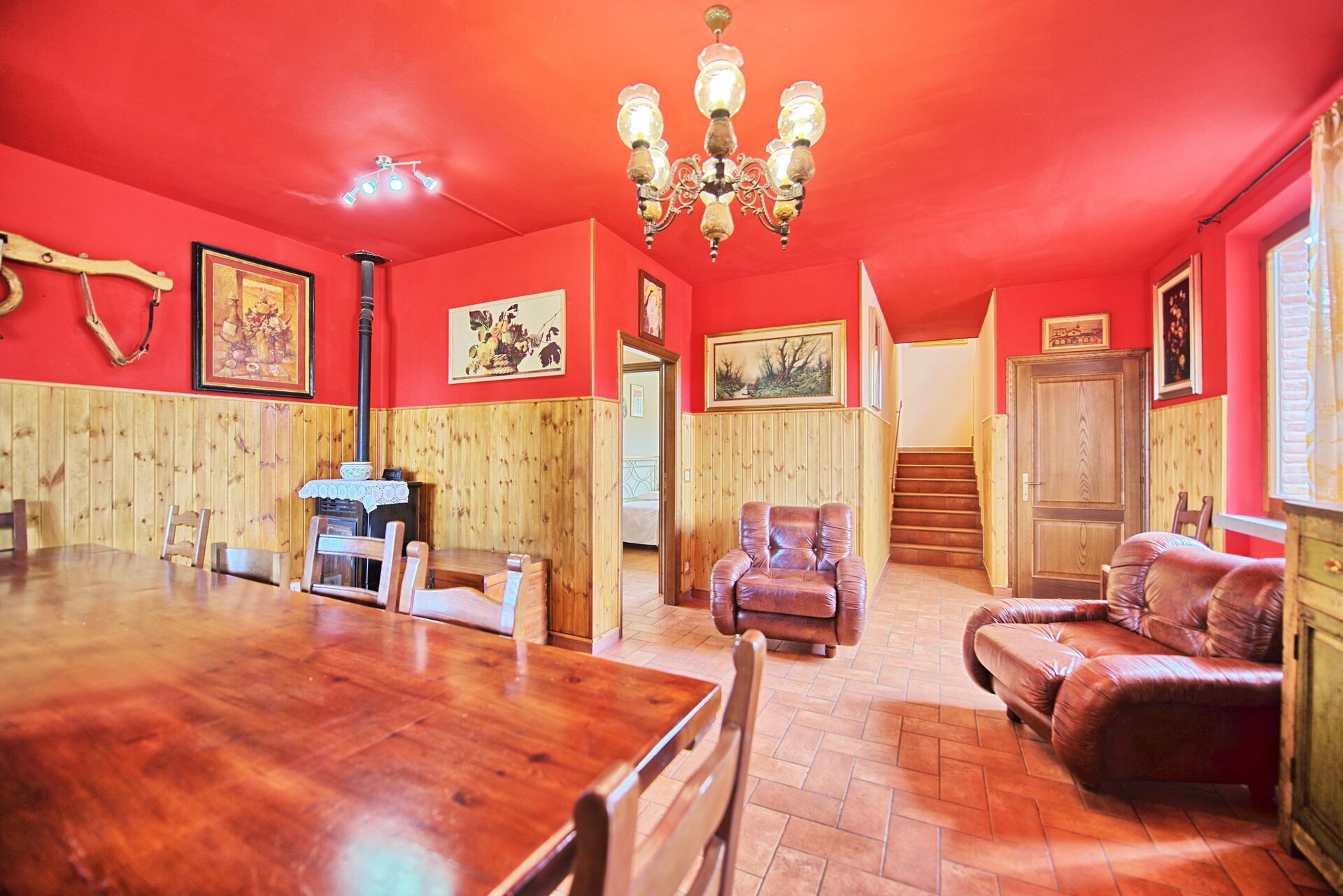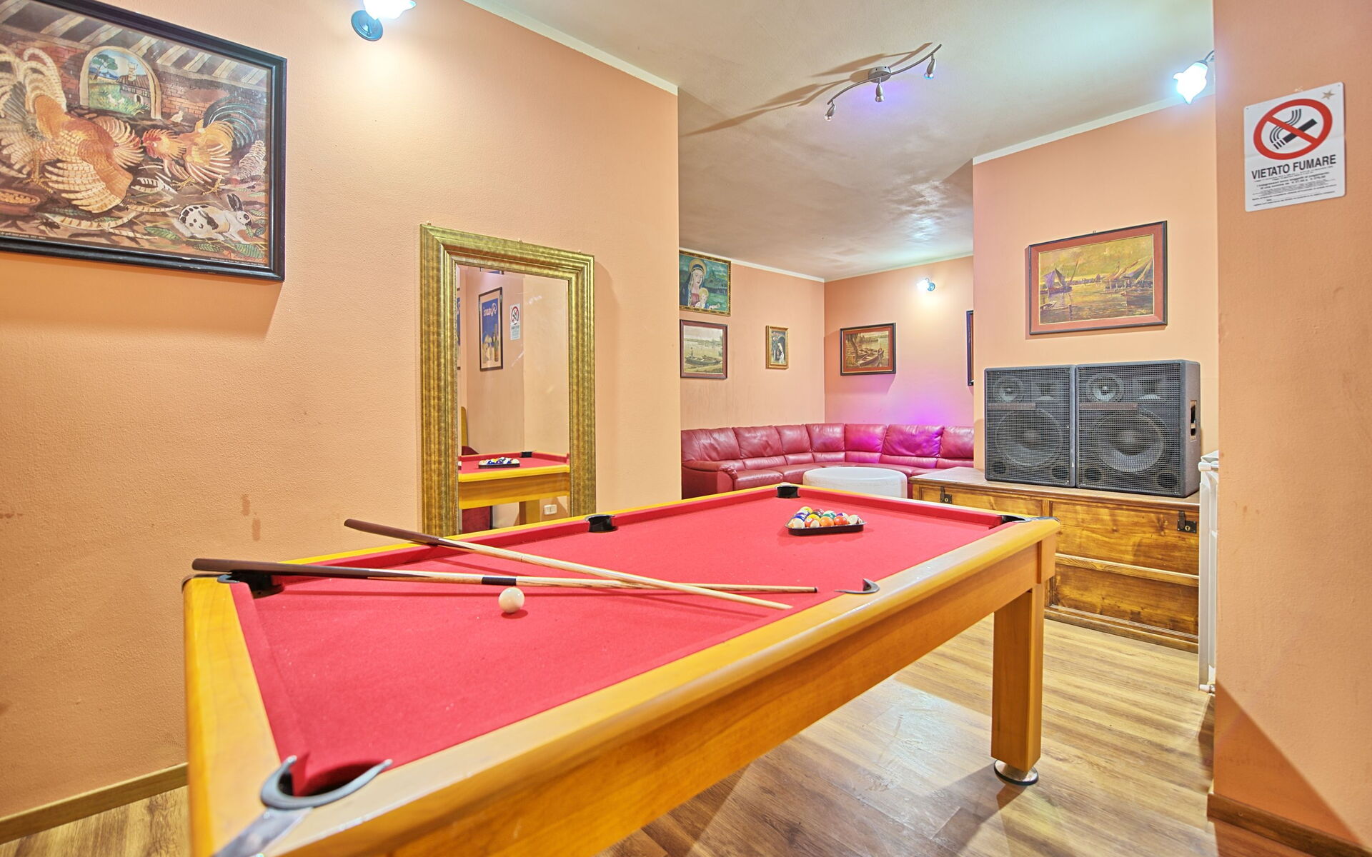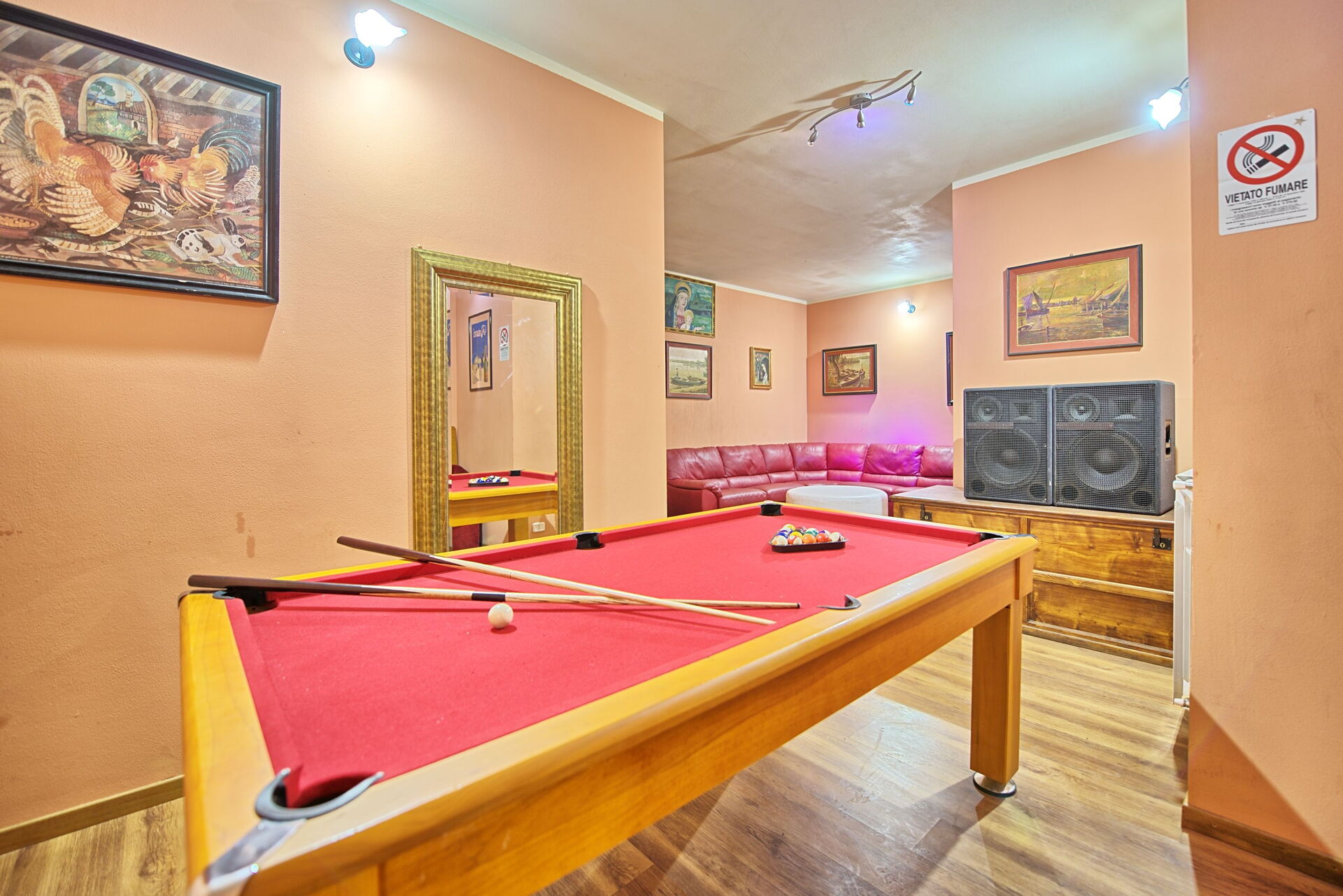 Lager gelegen verdieping(ook van buiten af op tuinniveau toegankelijk): grote ruimte met stereo installatie en disco verlichting, kamer met slaapbanken, biljarttafel(pool), slaapkamer met tweepersoonsbed, slaapkamer met tweepersoonsbed, badkamer met douche, wasruimte met wasmachine.