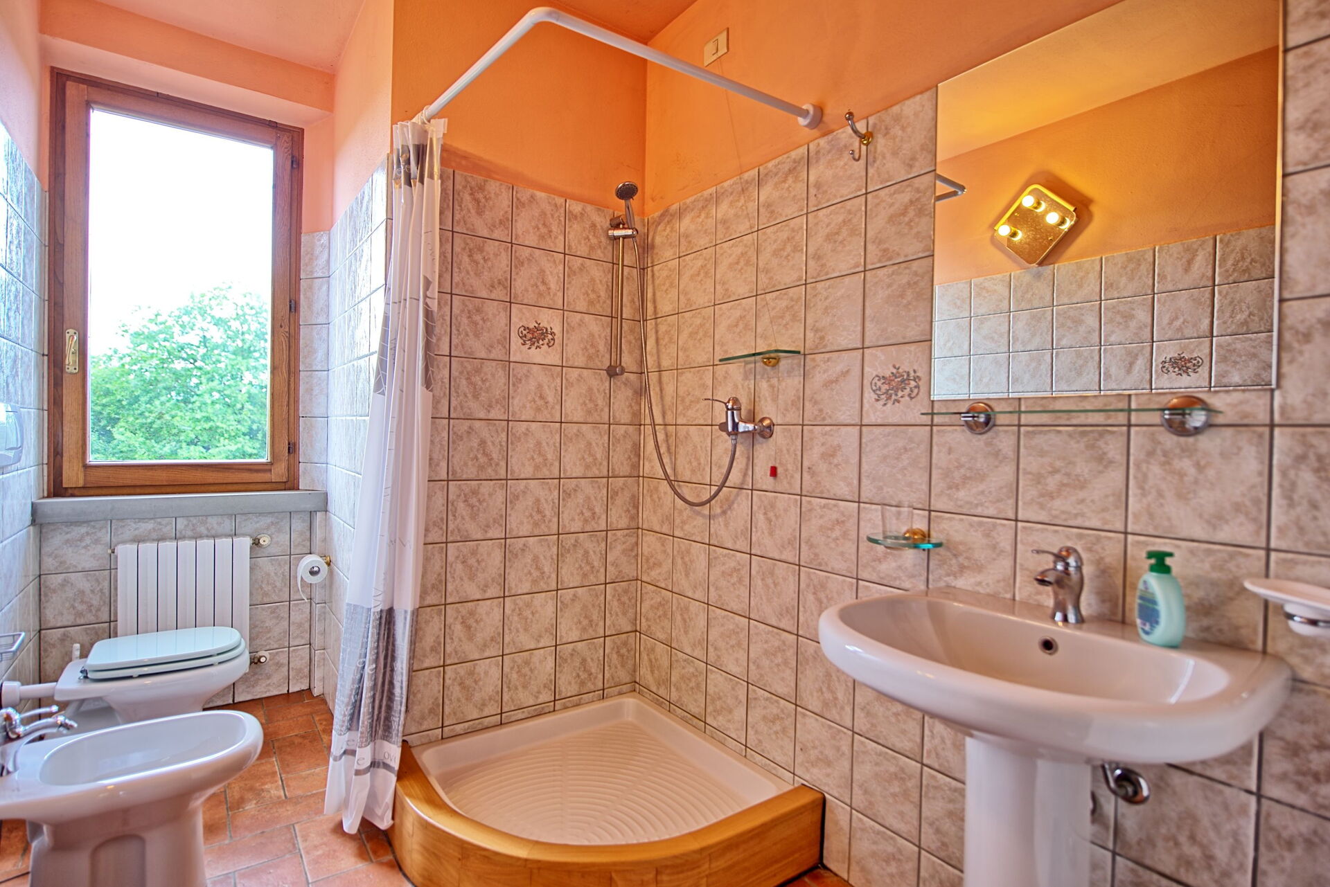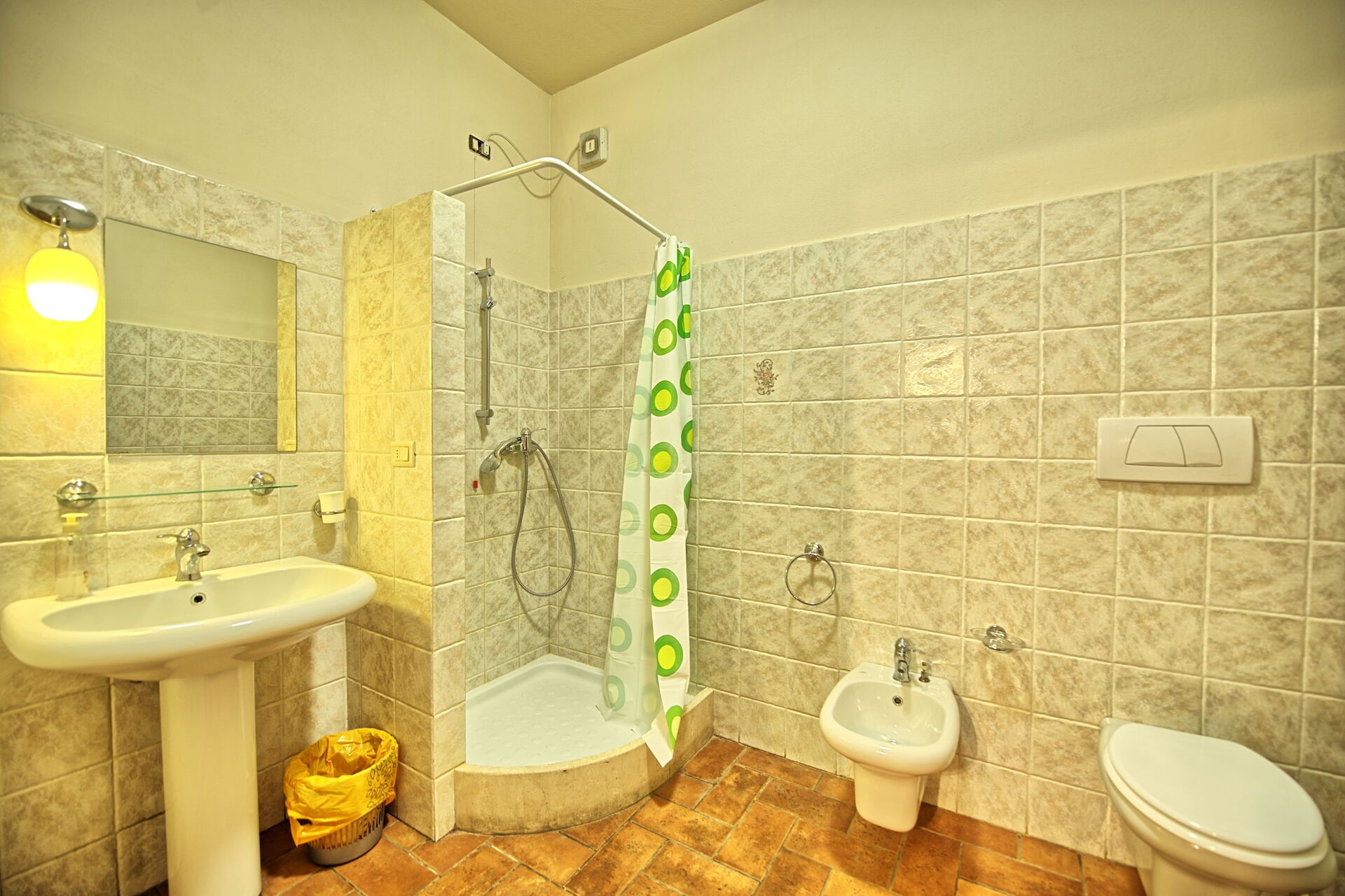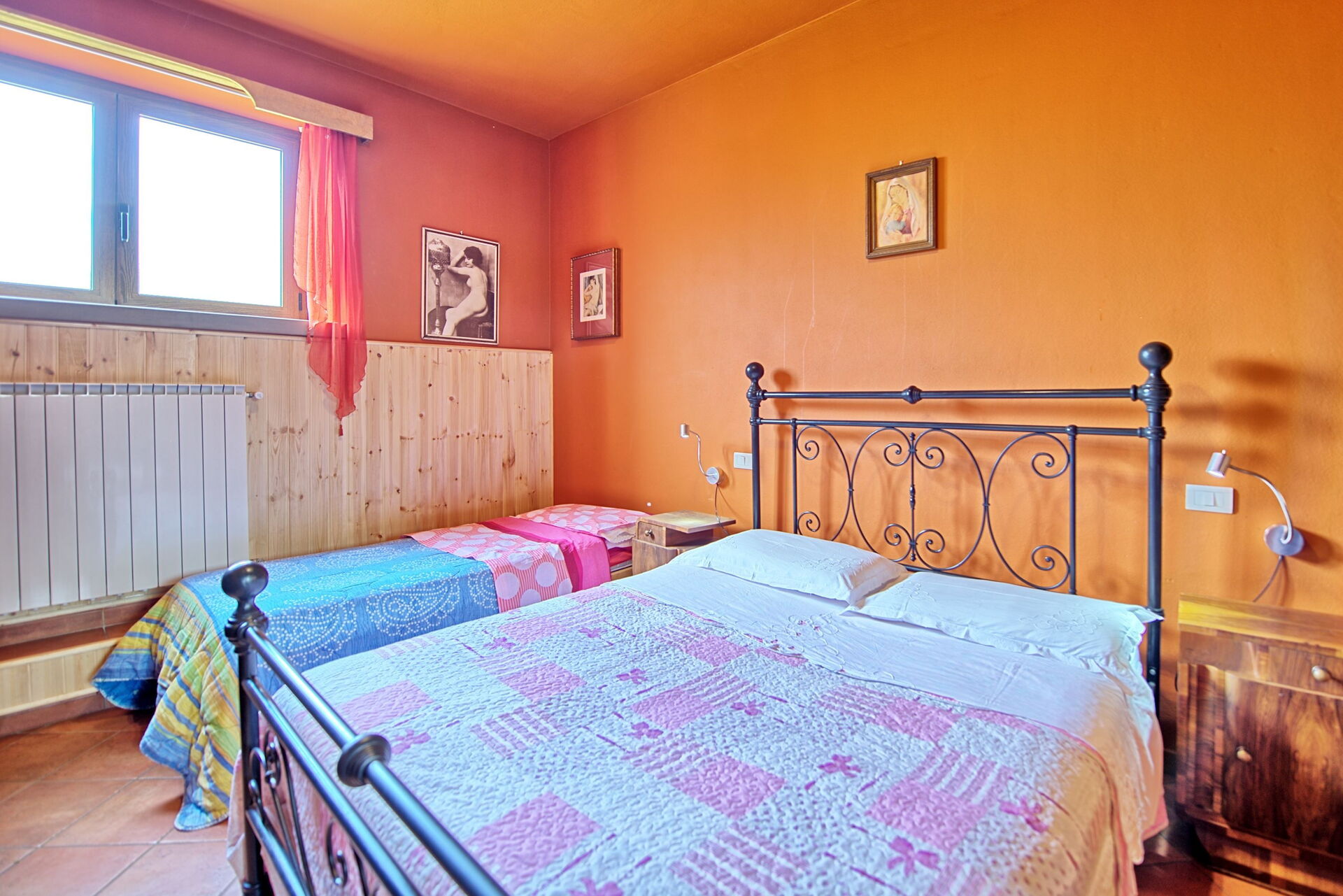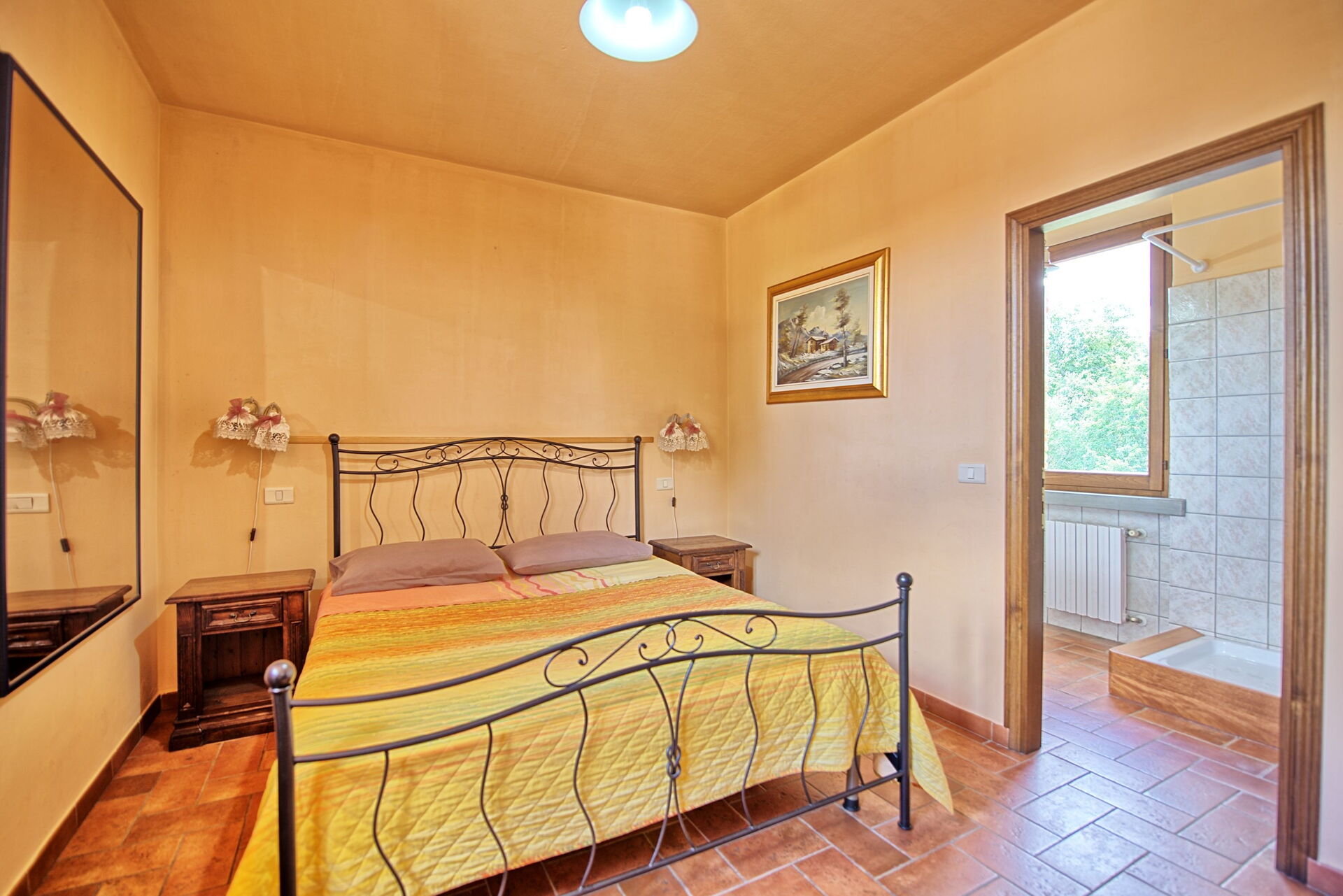 Eerste verdieping: slaapkamer (airconditioning) met tweepersoonsbed met privé badkamer met douche.