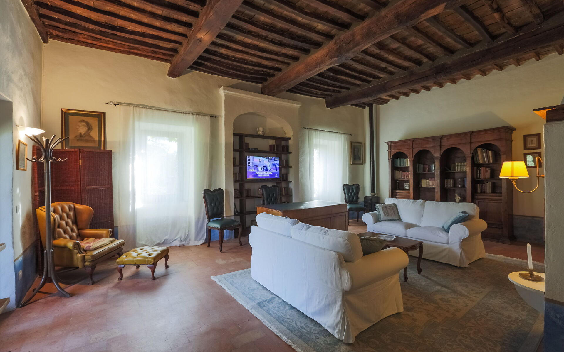 Woonkamer (30 m2): bank, fauteuil, eettafel (personen: 12), WIFI internet, airconditioning, hor, uitgang naar het terras.