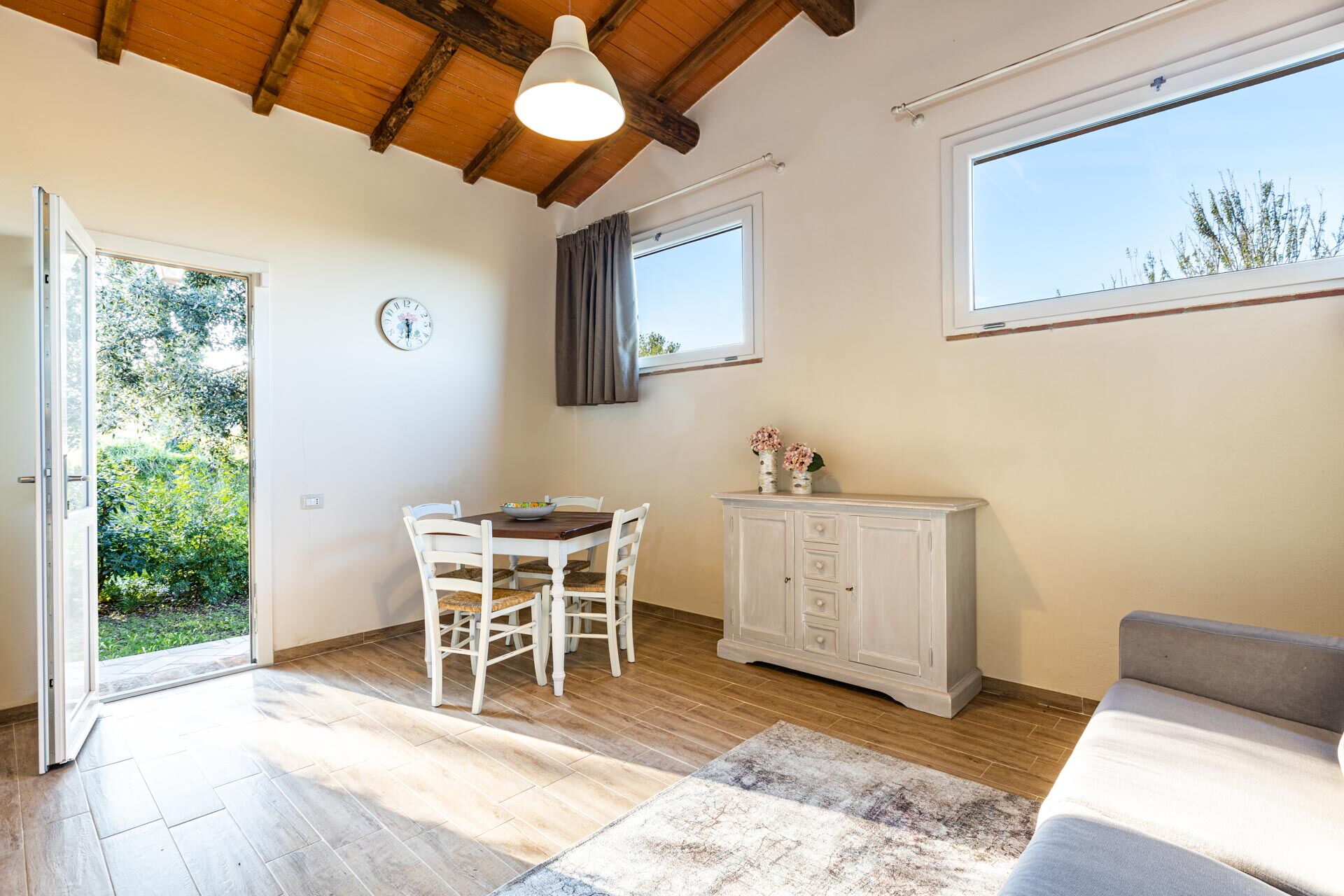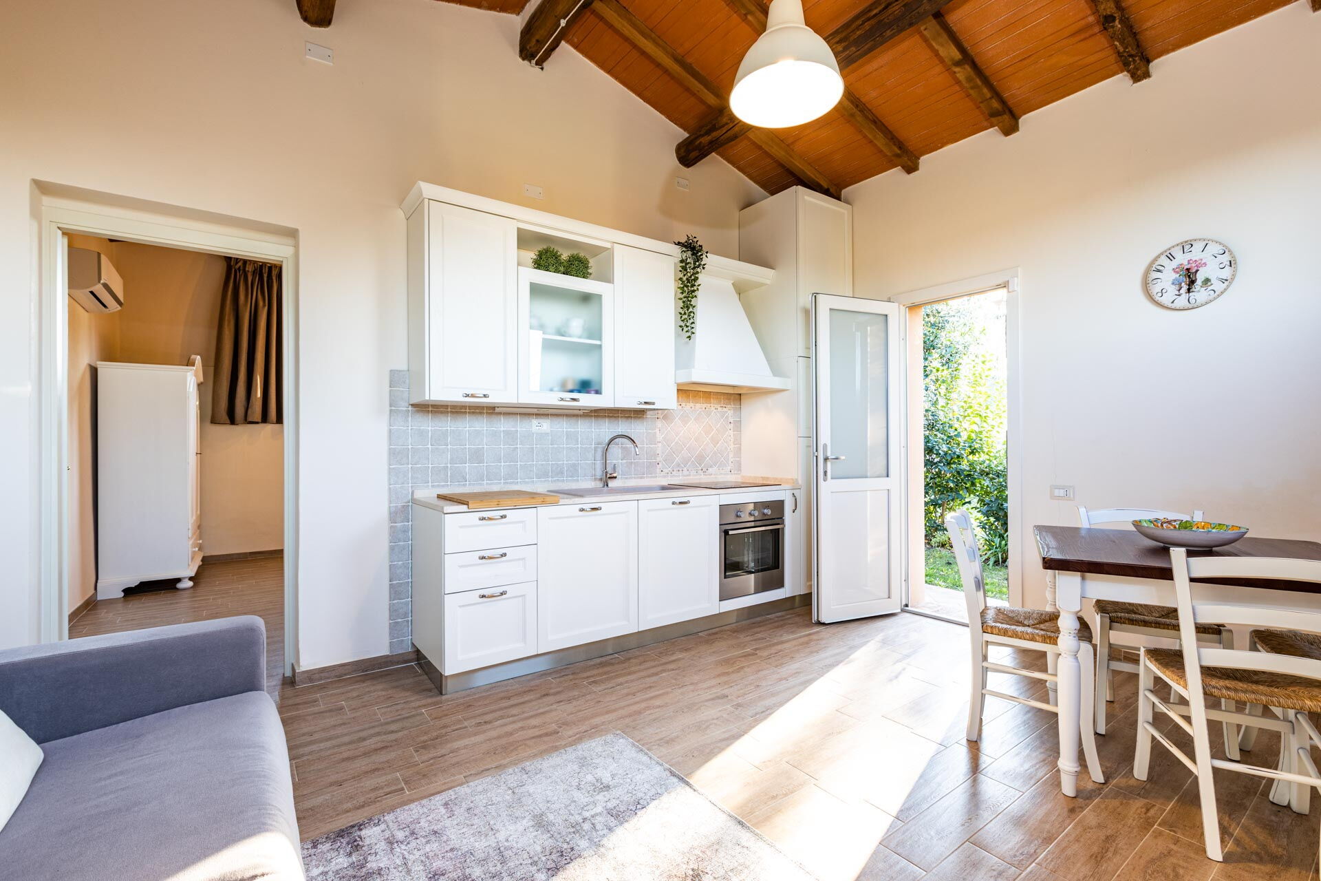 Keuken – woonkamer 2: goed uitgeruste keuken, eettafel (personen: 2), bank, uitgang naar de tuin.
