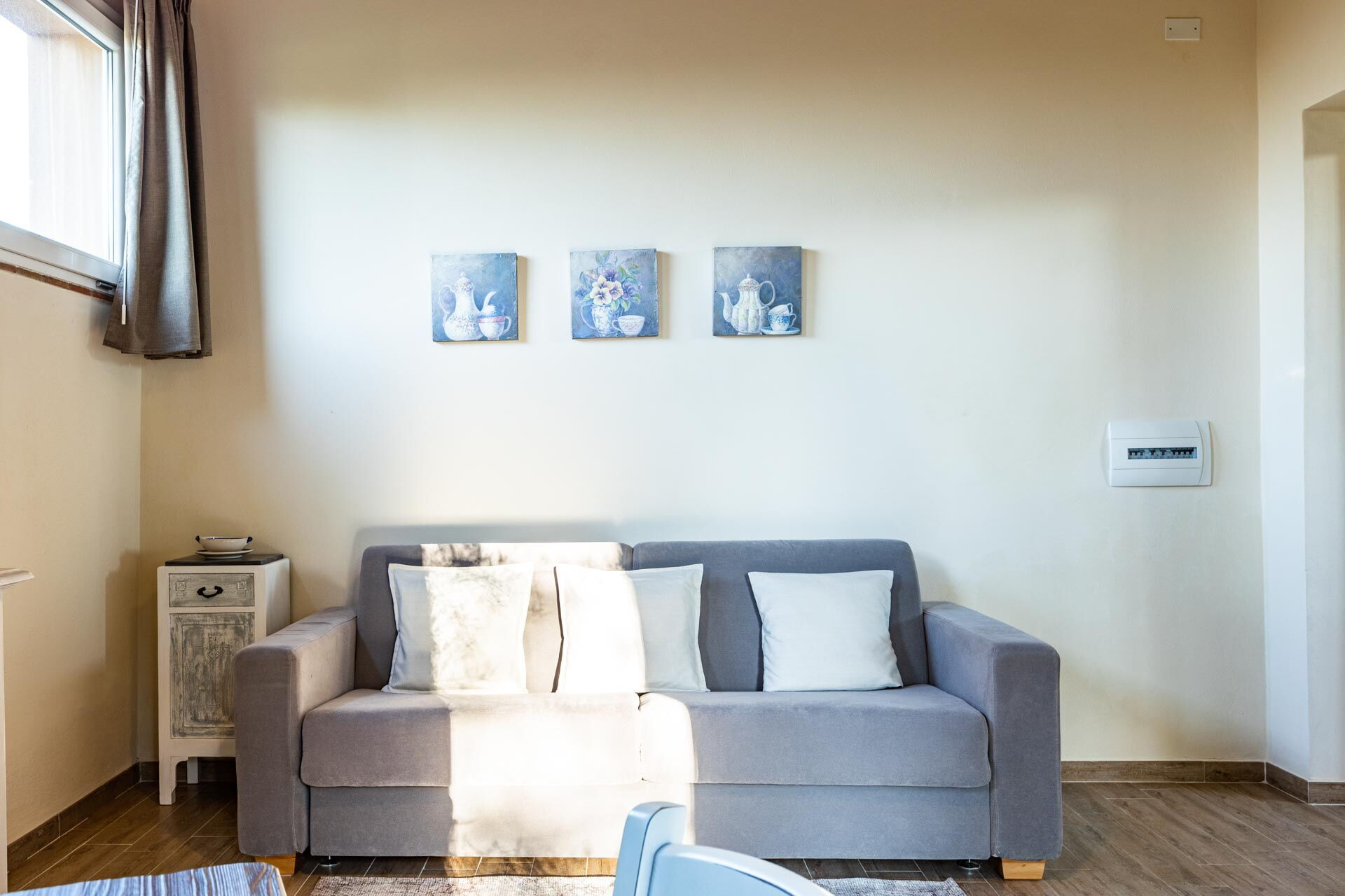 Woonkamer: twee banken, satelliet tv, uitgang naar de tuin, uitgang naar de patio.