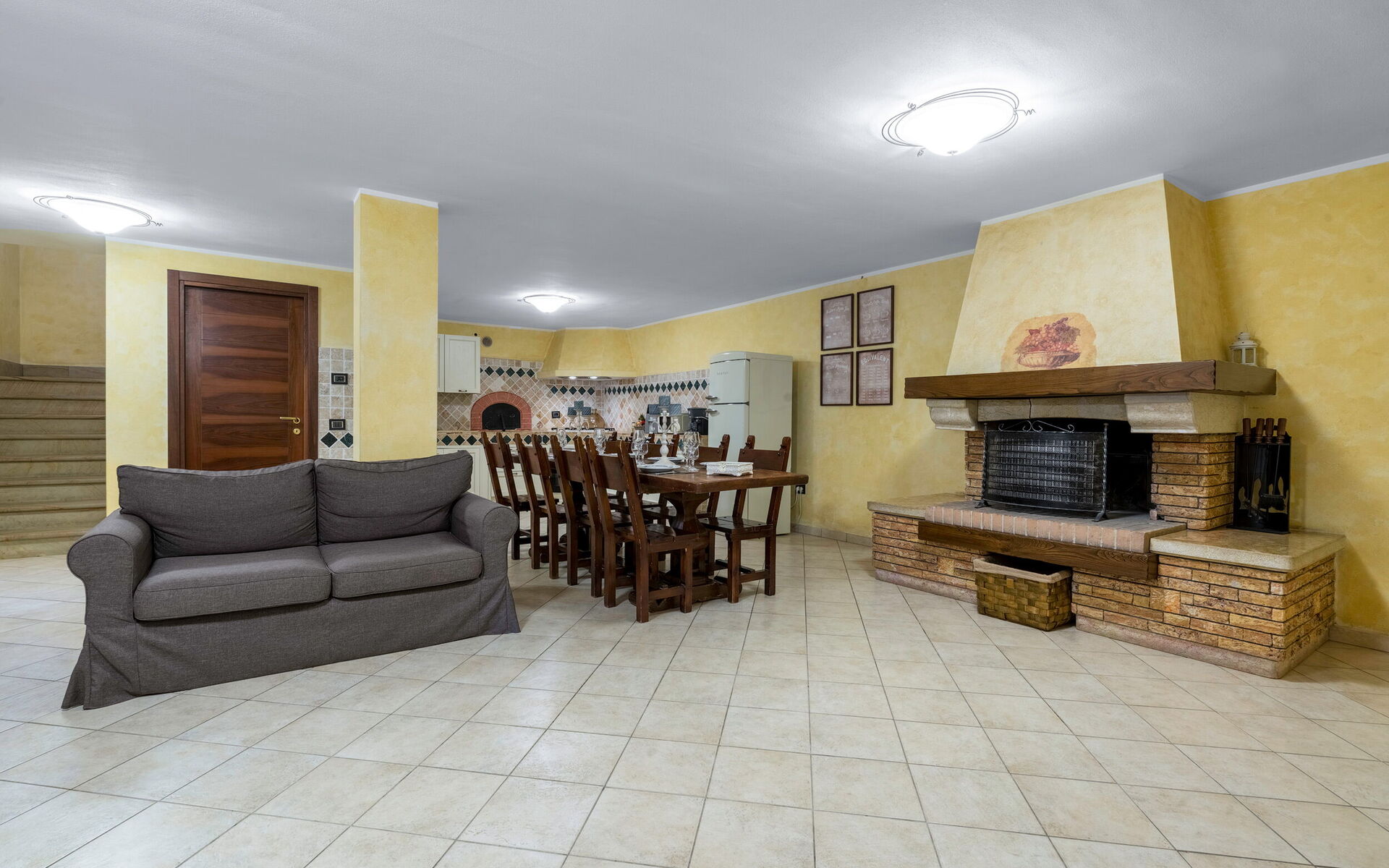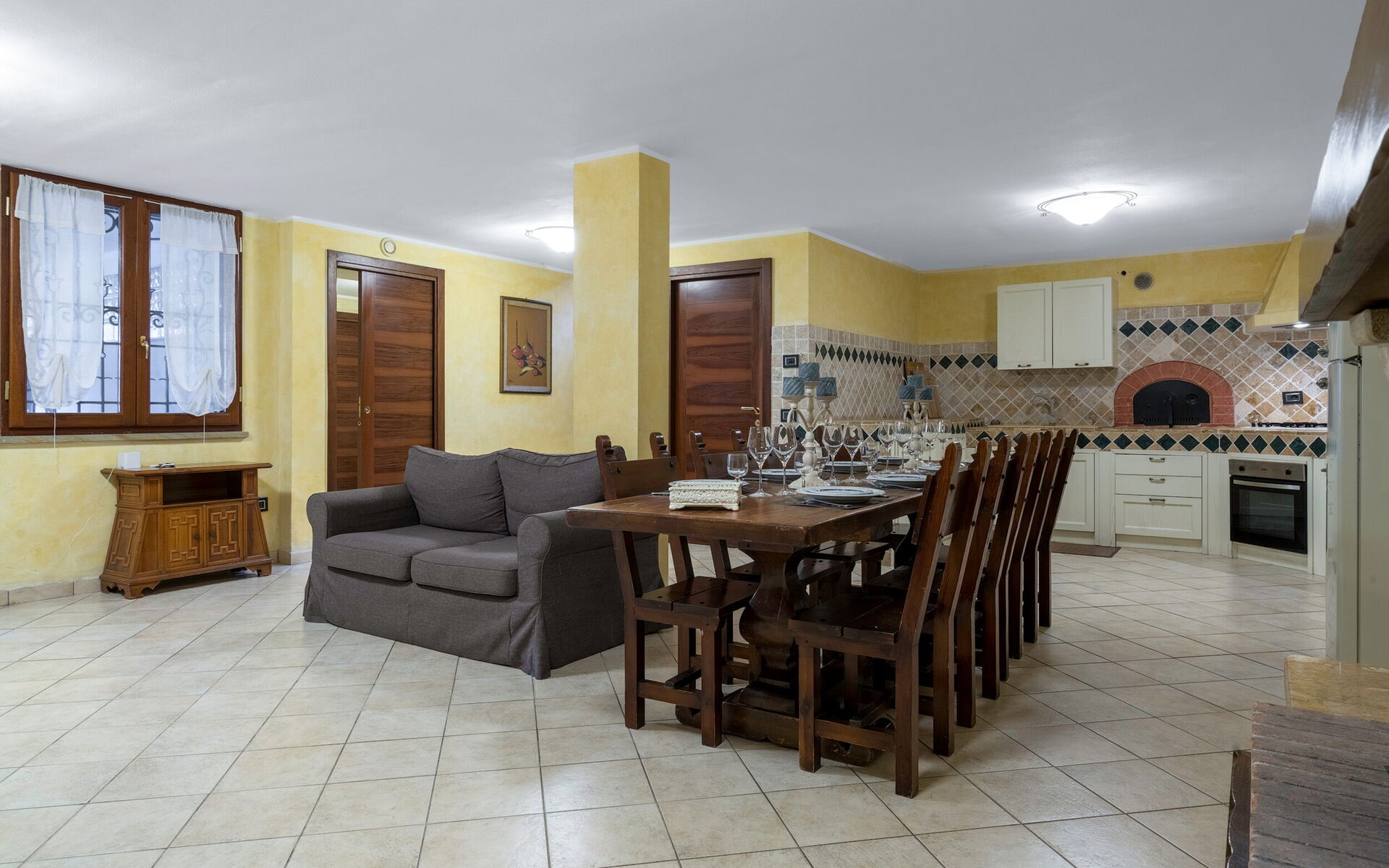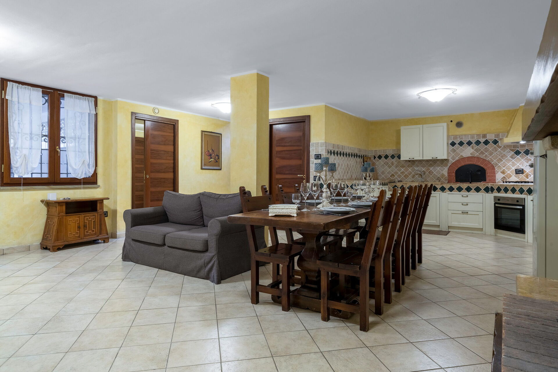Keuken – woonkamer: goed uitgeruste keuken, eettafel, vaatwasser, ijskast, diepvriezer, magnetron, kookplaat, oven, italiaans koffiezetapparaat, bank, WIFI internet, tv.