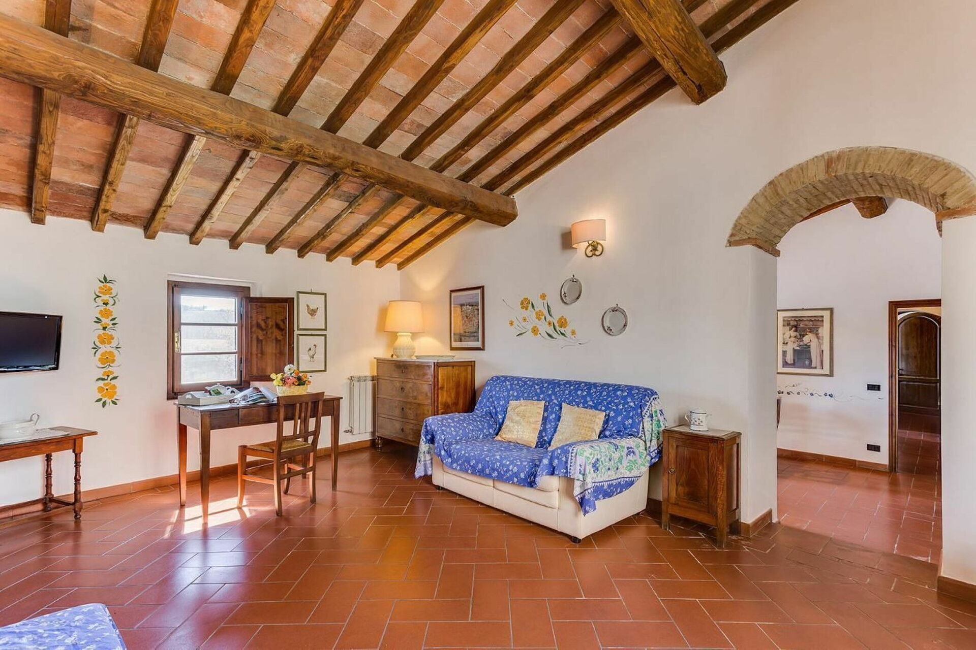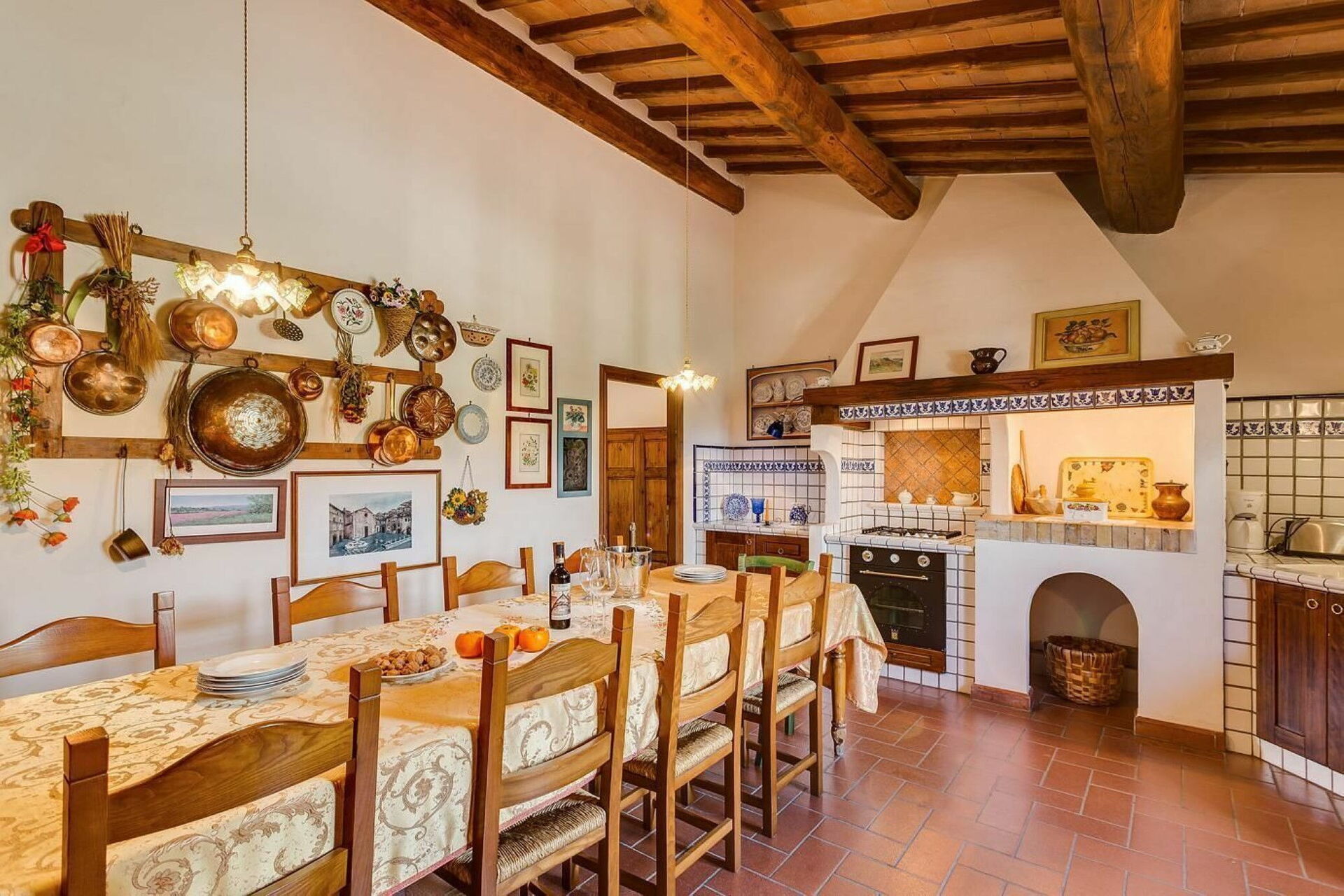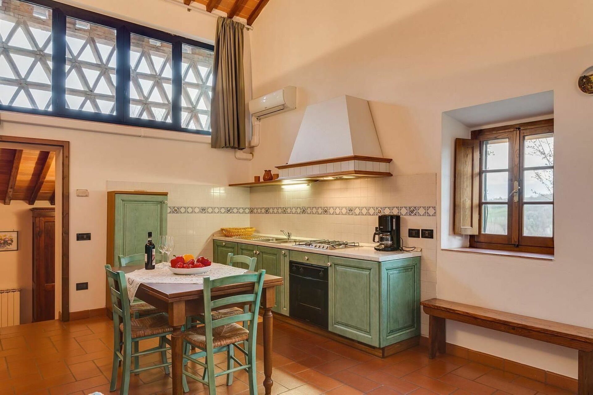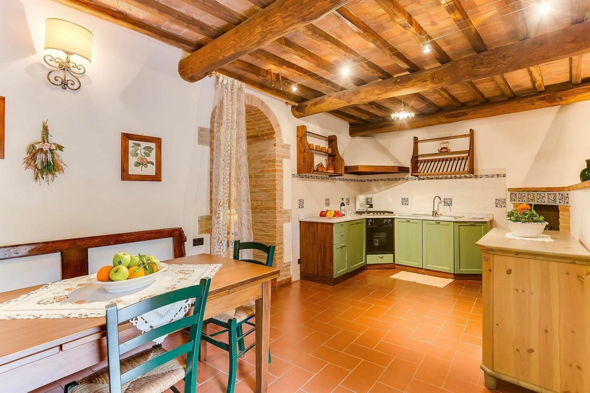 Keuken – woonkamer: goed uitgeruste keuken, eettafel (personen: 4), vaatwasser, ijskast, kookplaat, oven, bank, open haard, WIFI internet, airconditioning, tv.