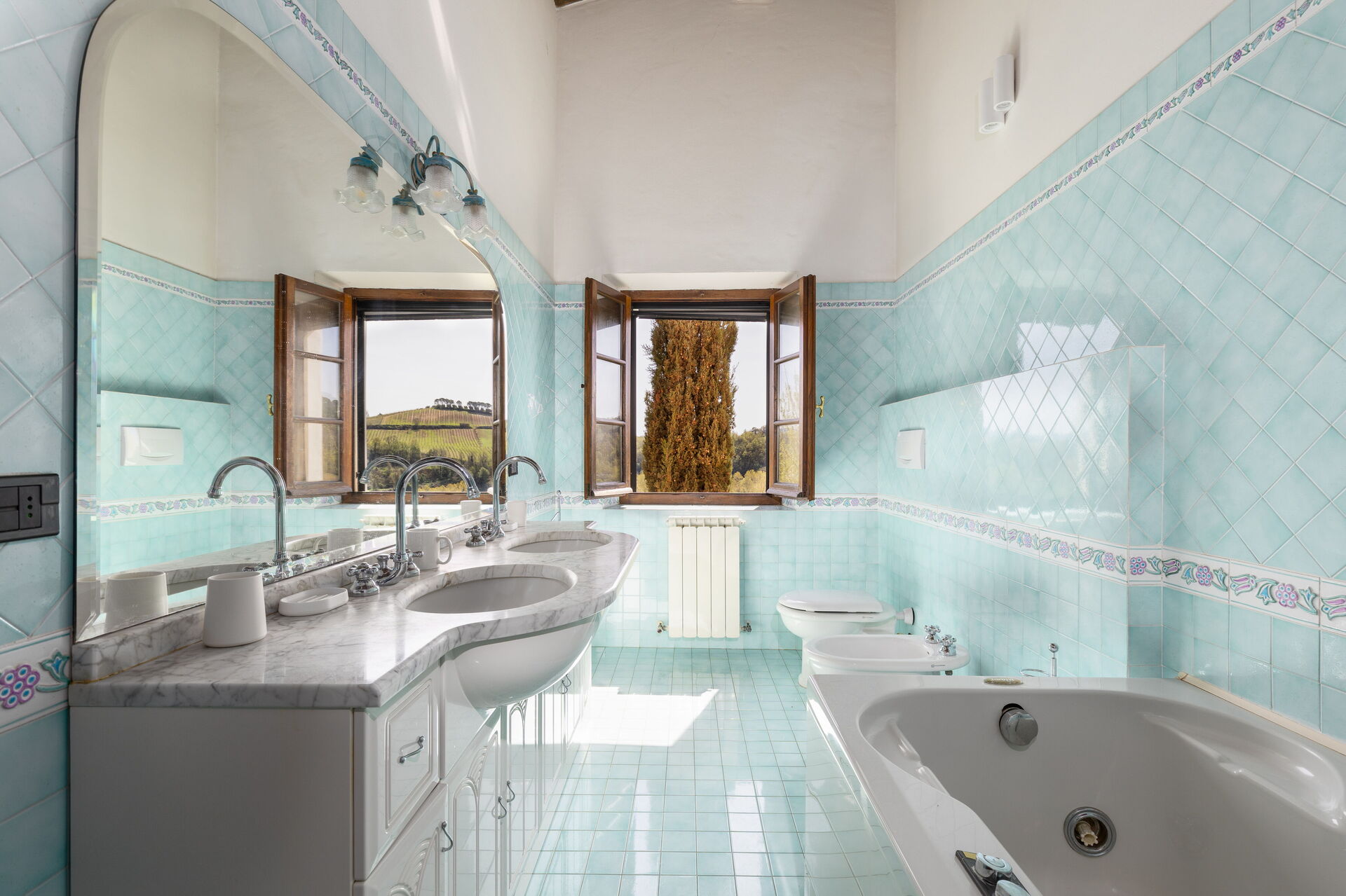 Badkamer: dubbele wastafel, toilet , bidet, bad, douche.