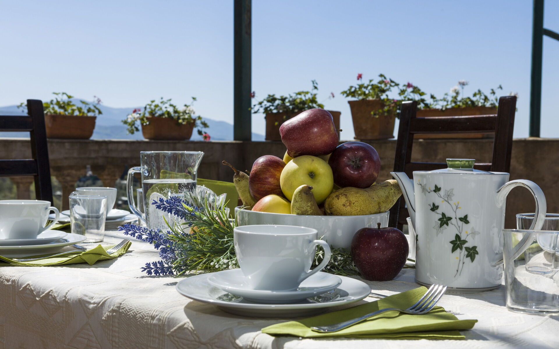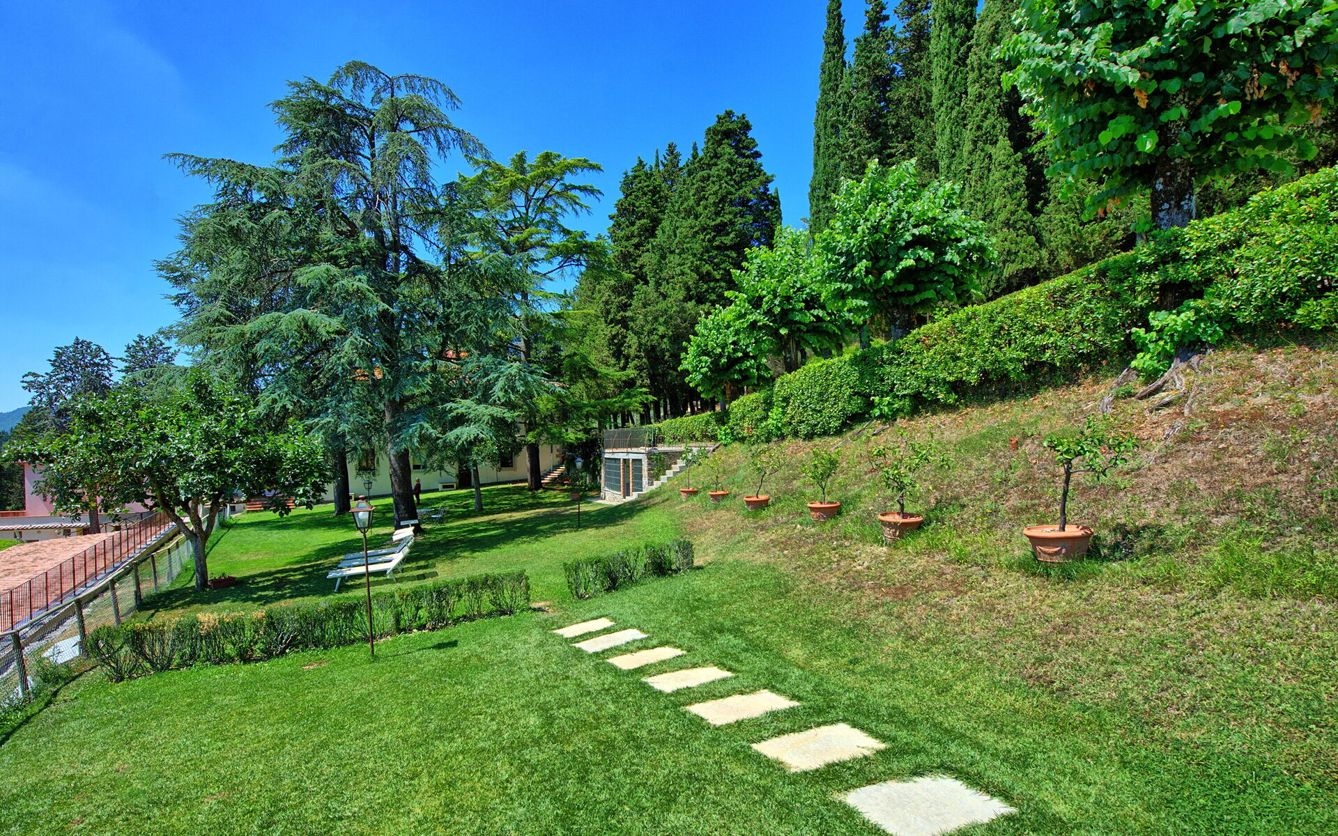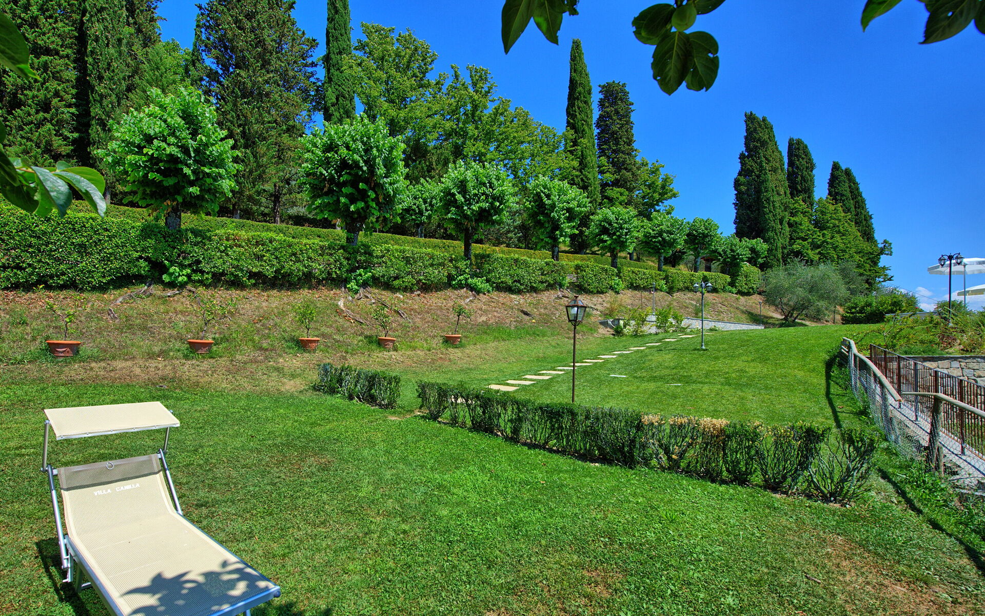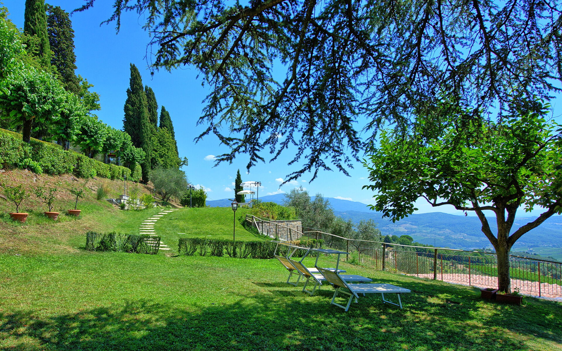 Buiten kunnen de gasten gebruikmaken van een grote tuin en een mooi panoramisch gelegen zwembad.