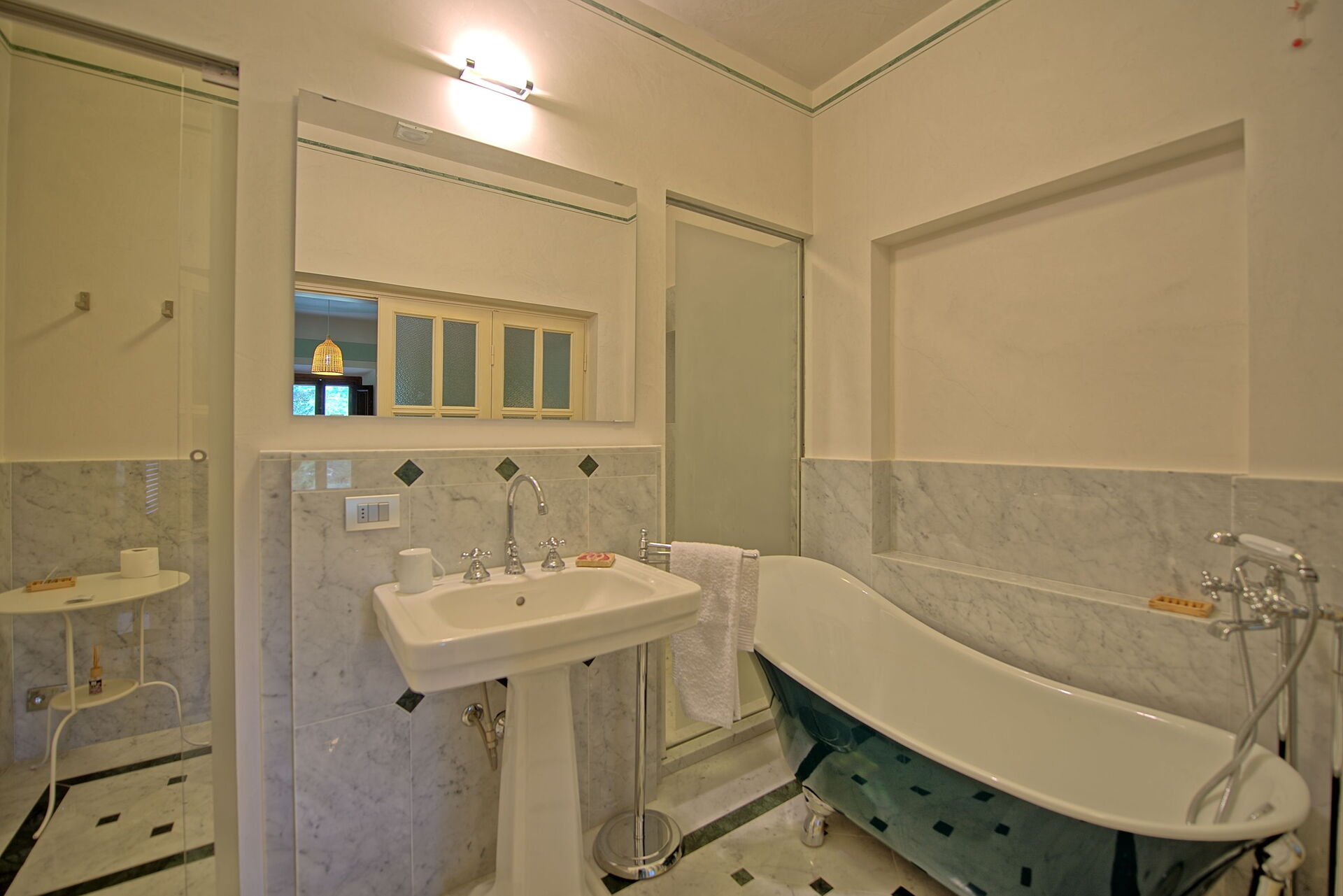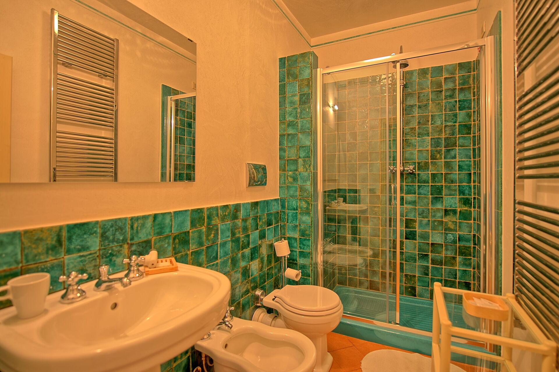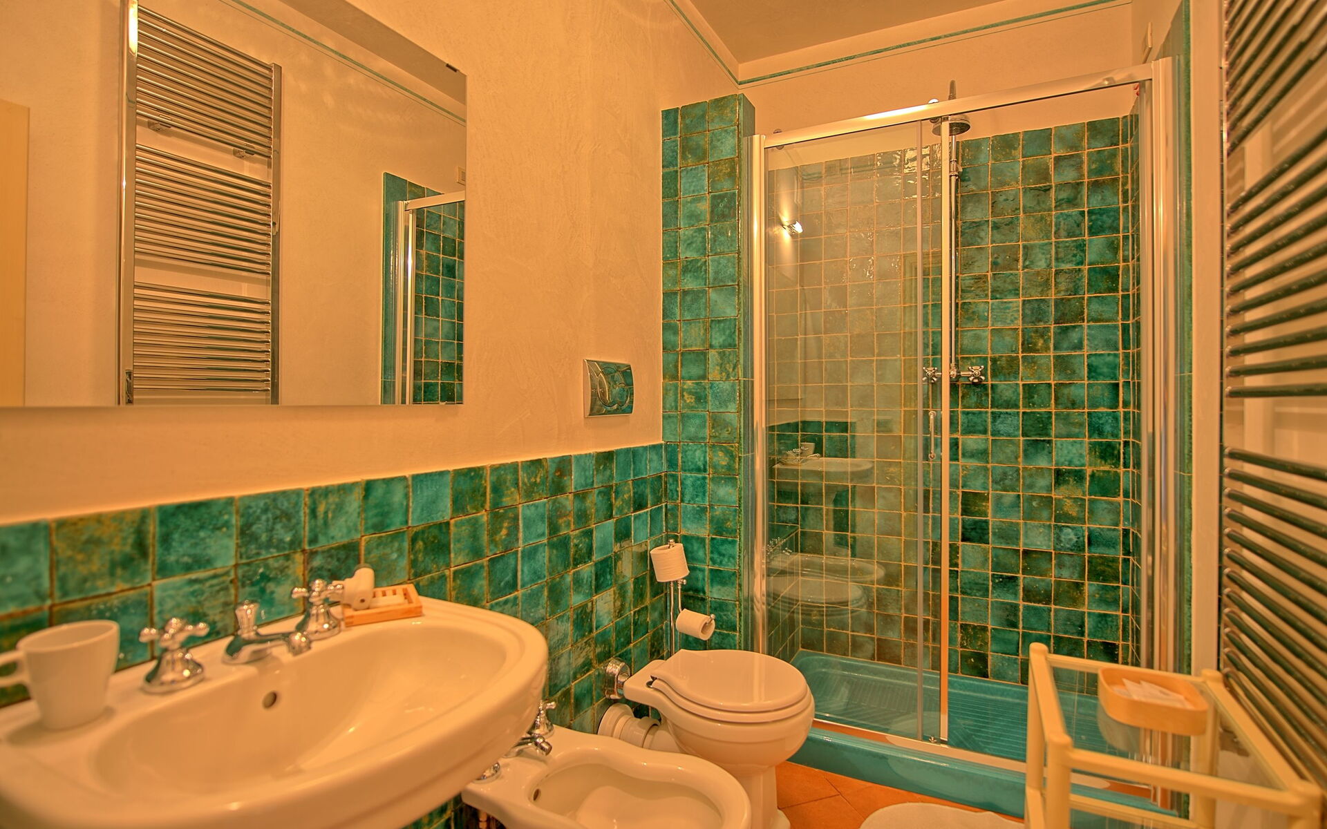 4 treden hoger:slaapkamer met tweepersoonsbed en privé badkamer met douche, 2 slaapkamers, beide met 2 eenpersoonsbedden en privé badkamers met douche (zonder aaam), suite met een tweepersoonsbed en privé badkamer met bad en douche (men bereikt de badkamer via 3 treden omhoog van de slaapkamer).