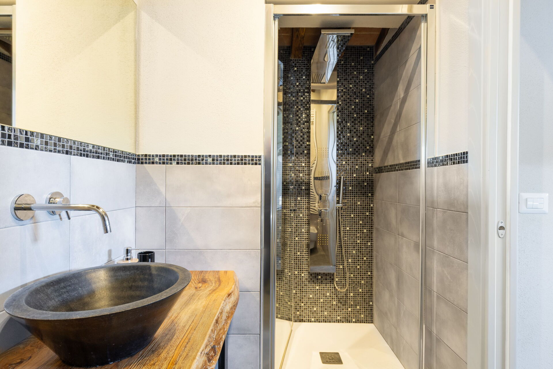 Eerste verdieping: slaapkamer met tweepersoonsbed (airconditioning) met en-suite badkamer met douche, slaapkamer met tweepersoonsbed (airconditioning, niet-werkende open haard) met eigen badkamer met douche en directe toegang naar buiten.