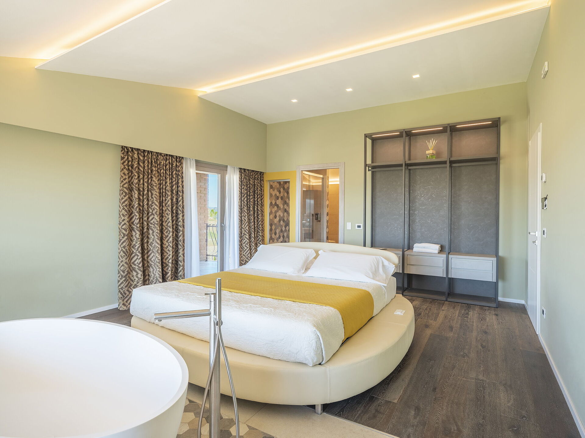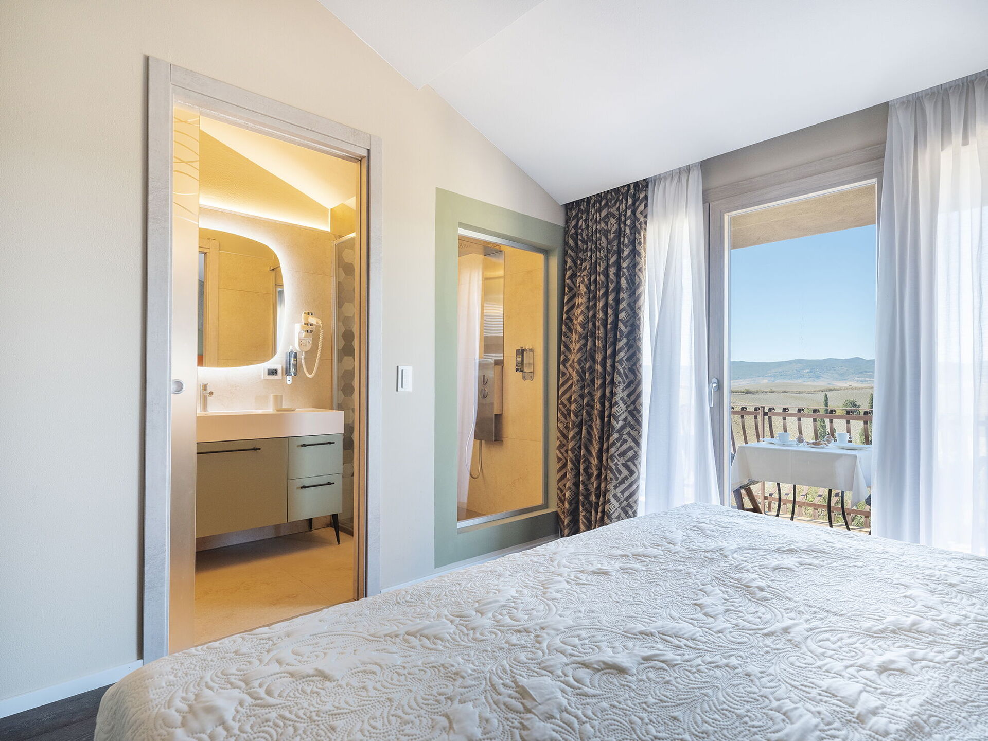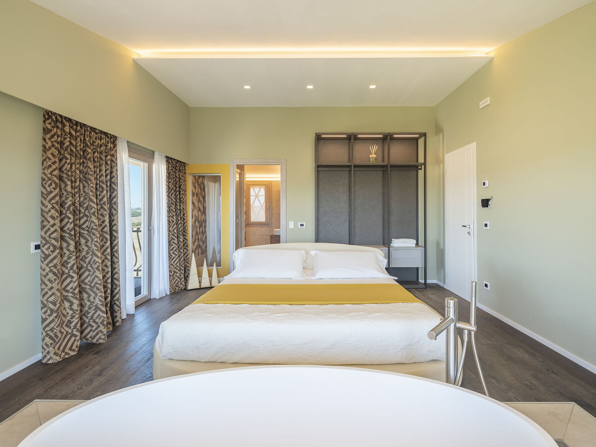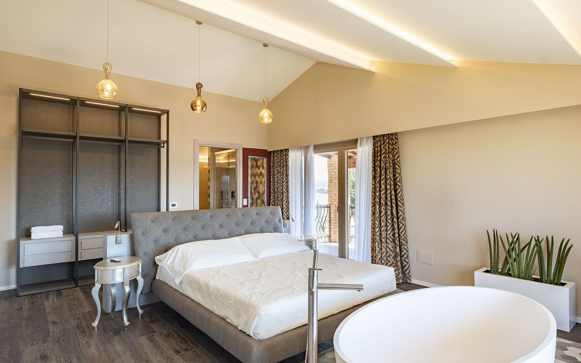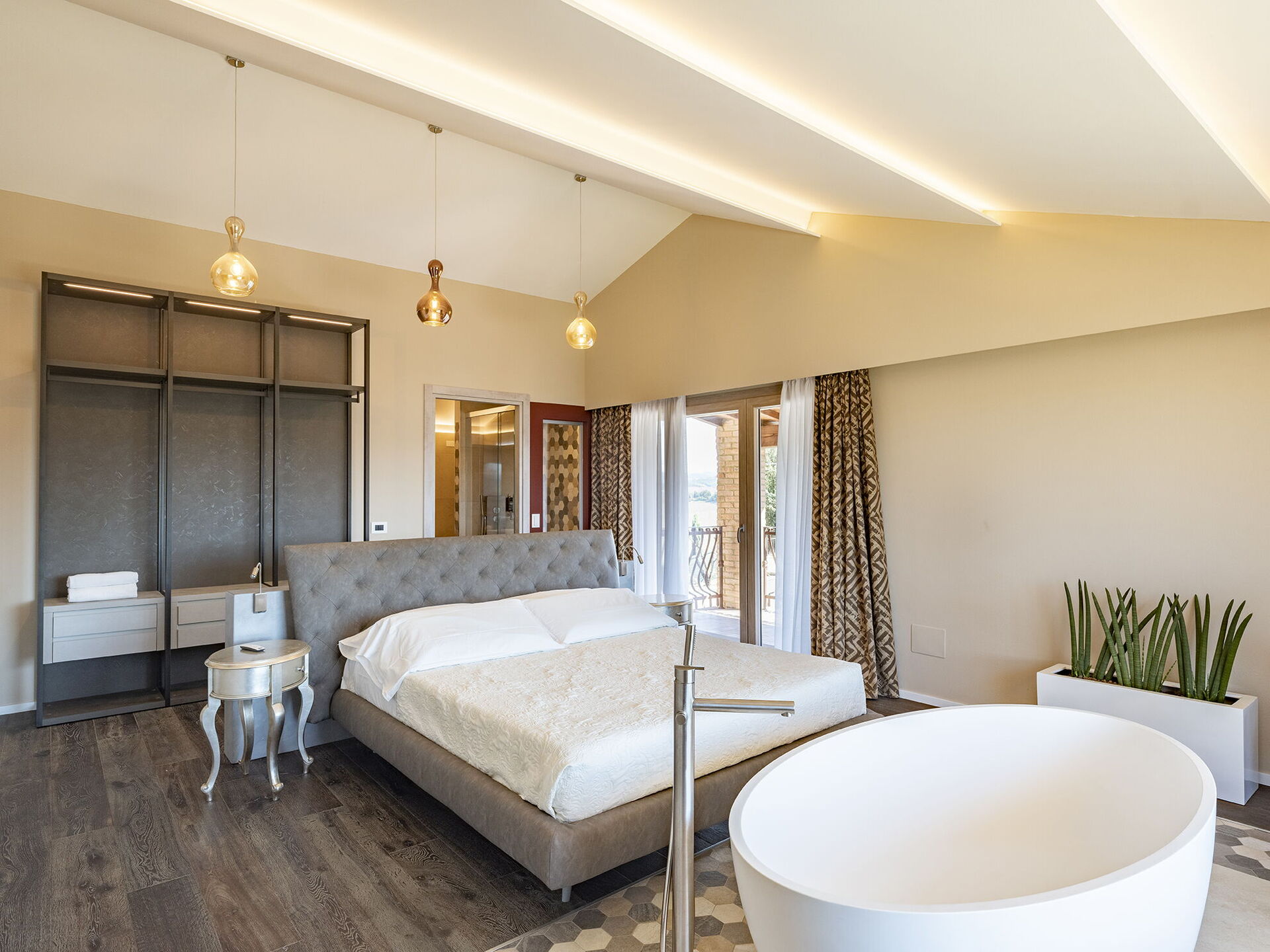 1 tweepersoonskamer met ligbad in de kamer en een eigen badkamer met douche; toegang tot privé terras.