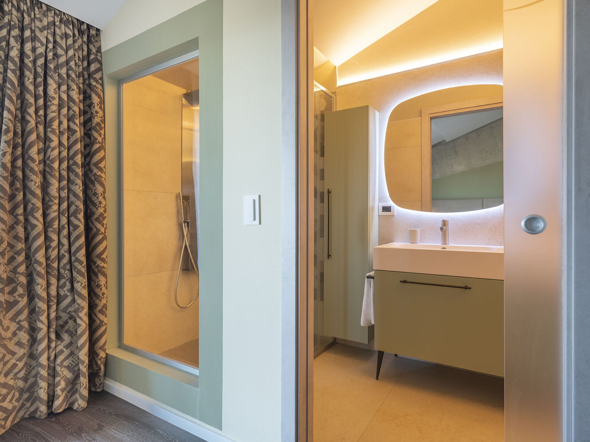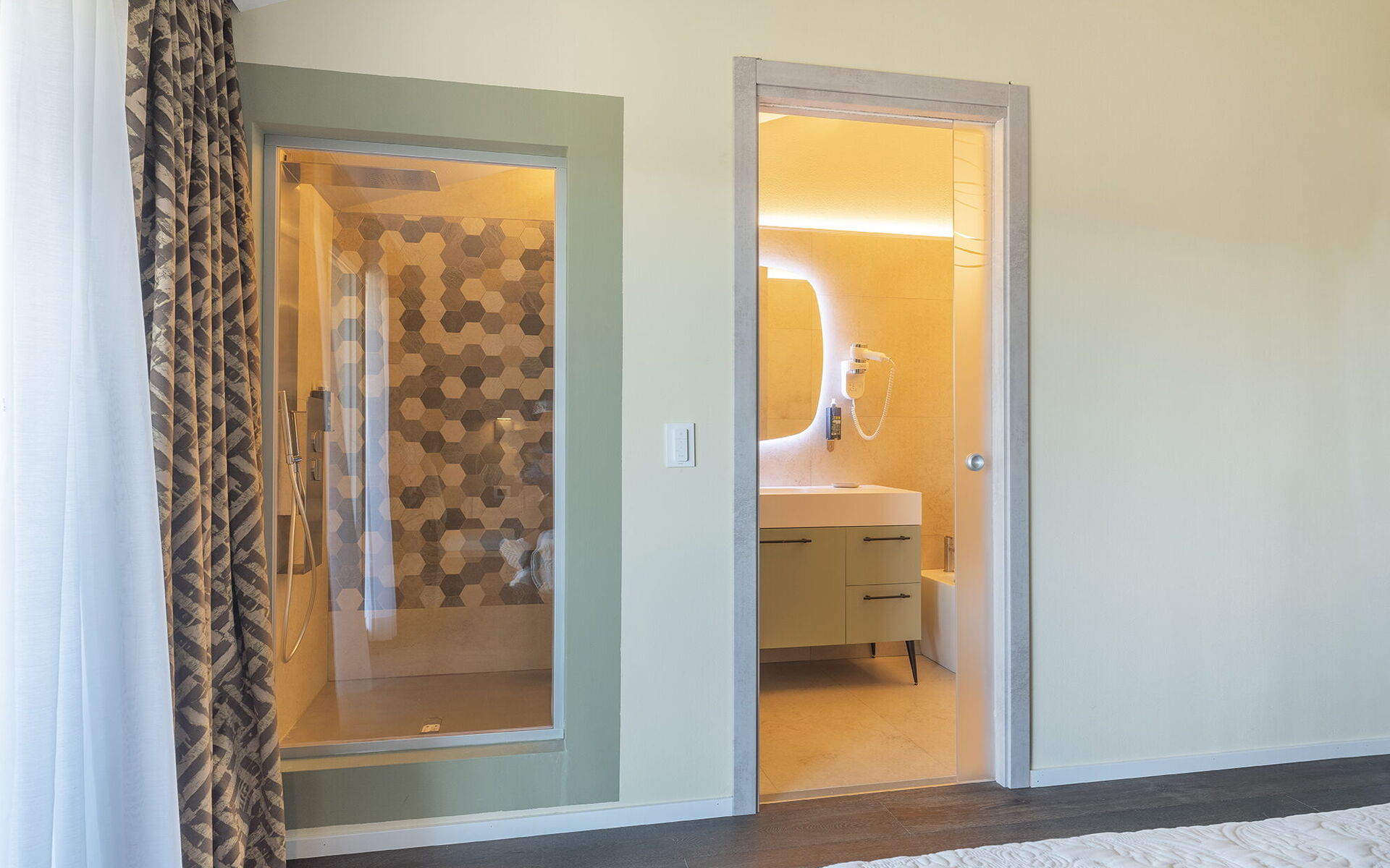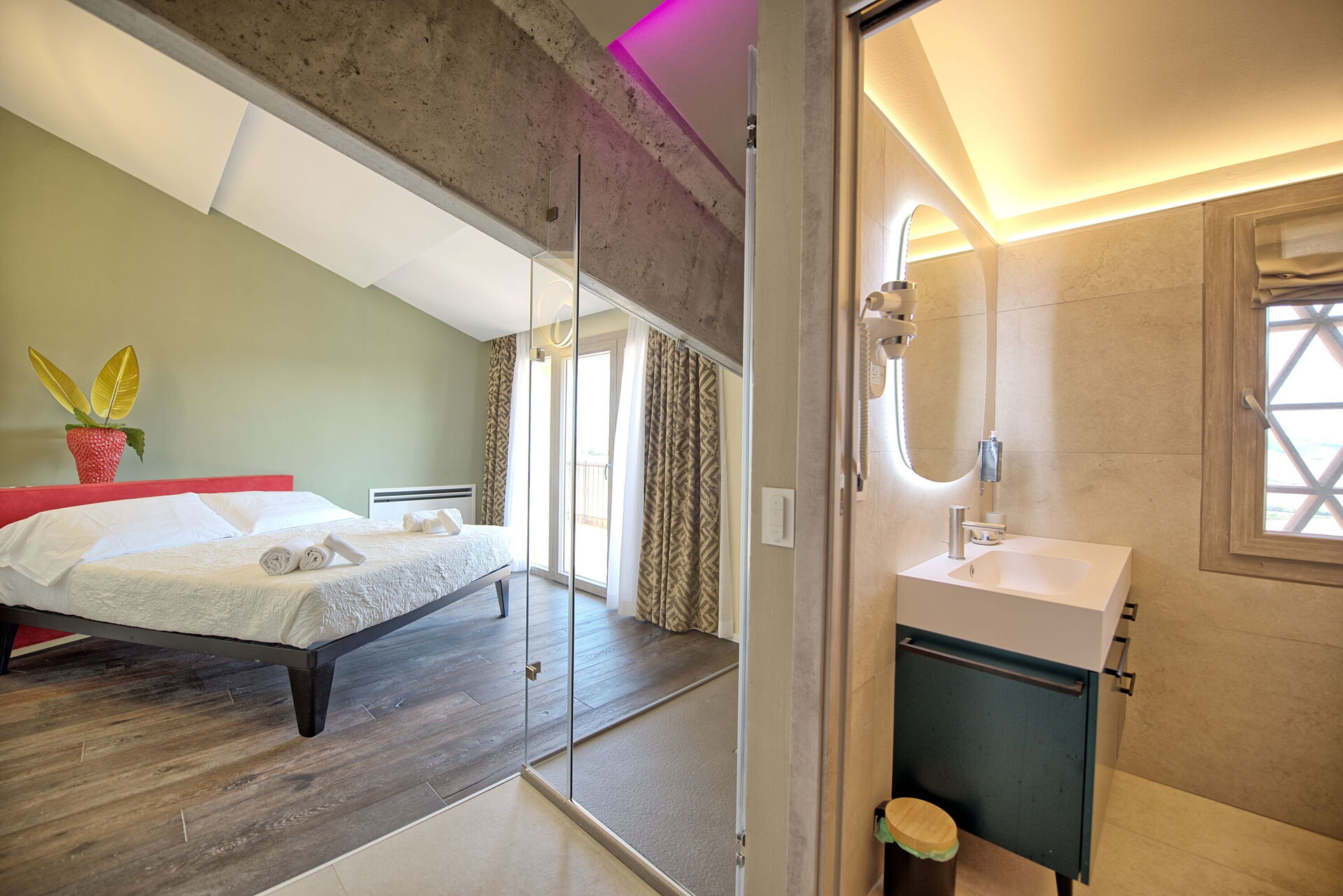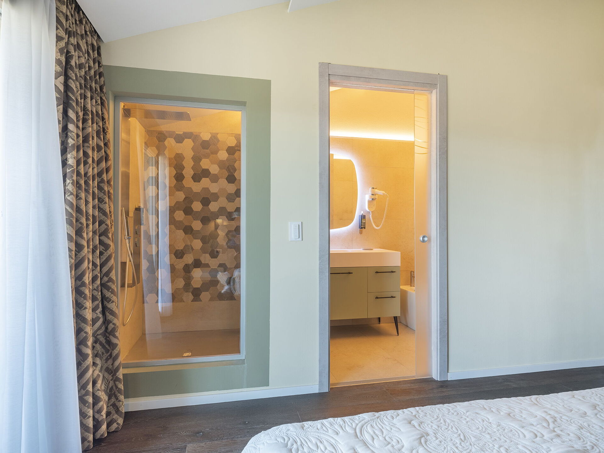 1 tweepersoonskamer met ligbad in de kamer en een eigen badkamer met douche; toegang tot privé terras;