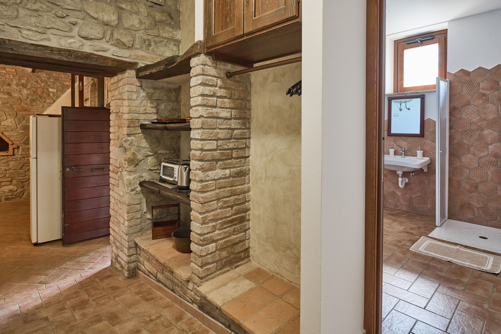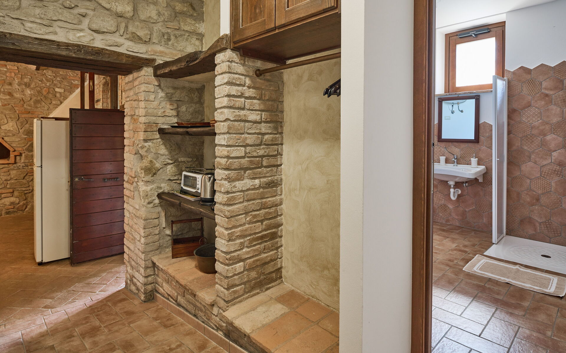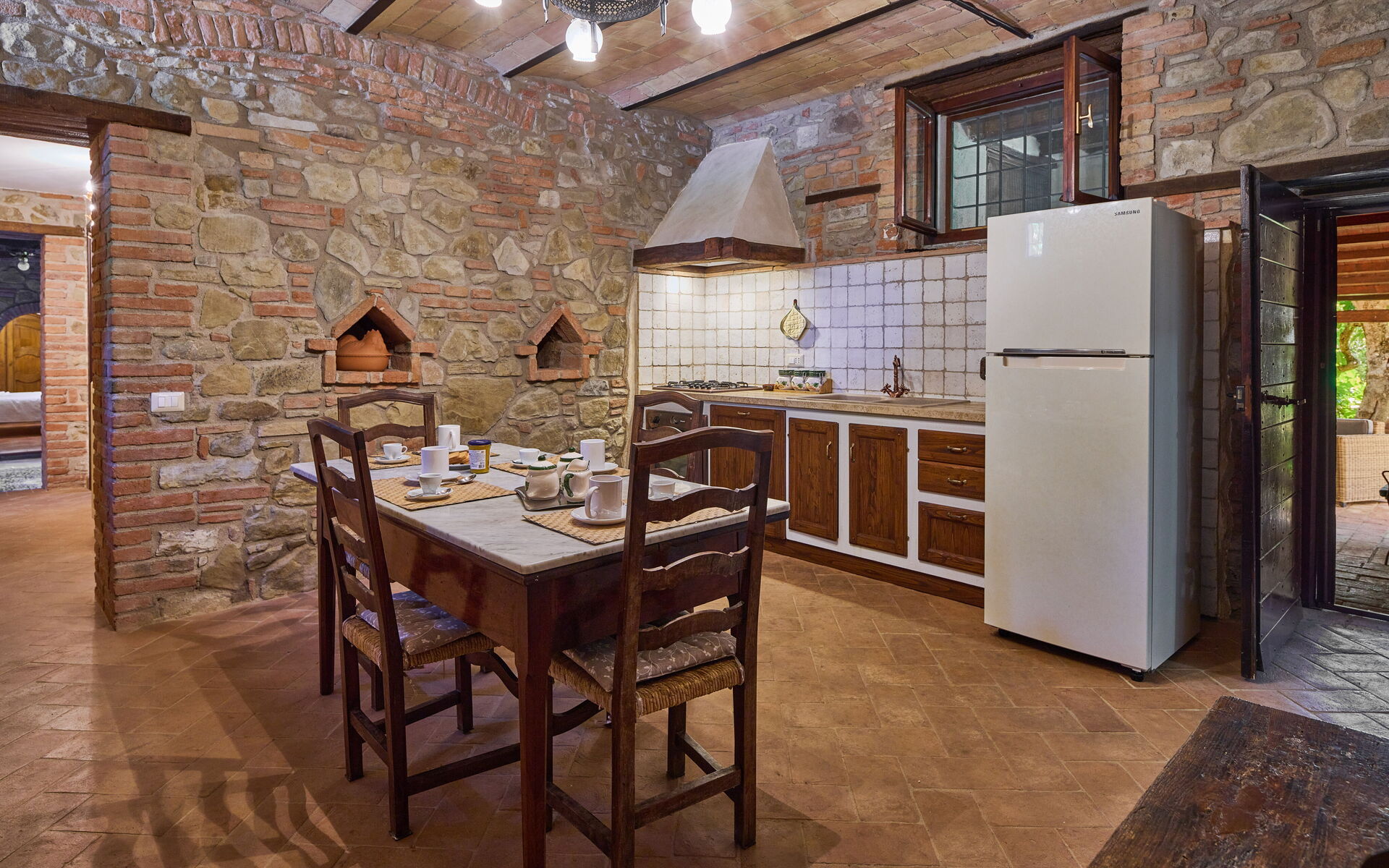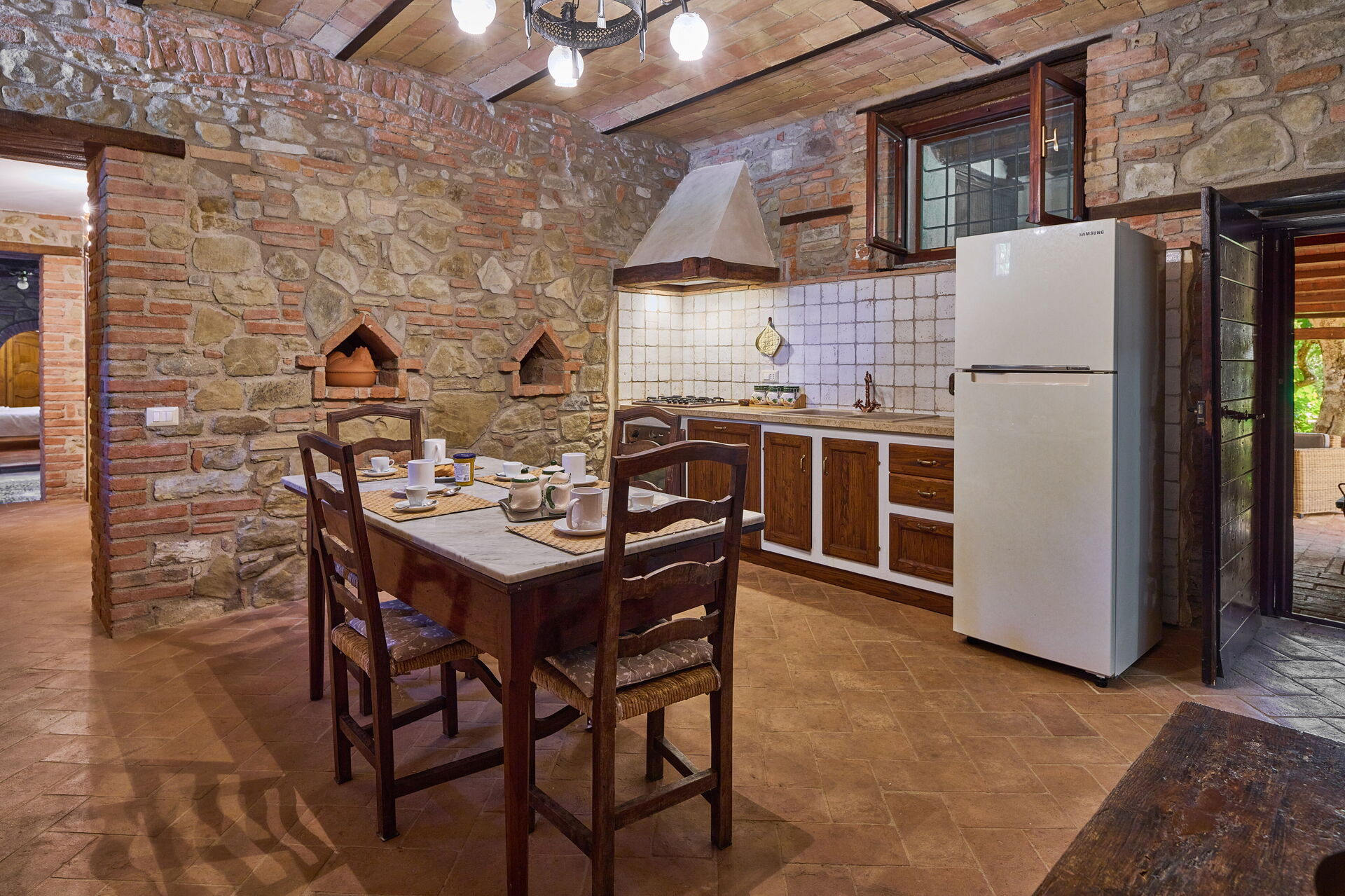 Keuken (16 m2): goed uitgeruste keuken, eettafel, ijskast, diepvriezer, kookplaat, oven, strijkijzer, italiaans koffiezetapparaat, wasmachine, WIFI internet, hor, kinderstoel, rookmelder, uitgang naar de patio.
