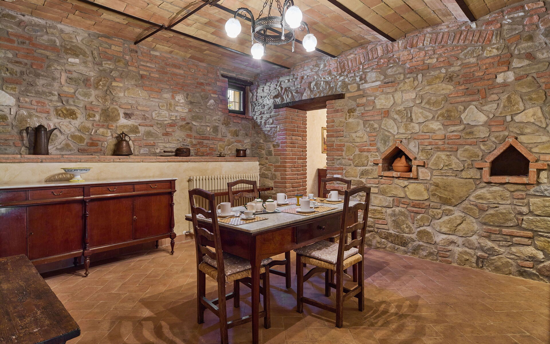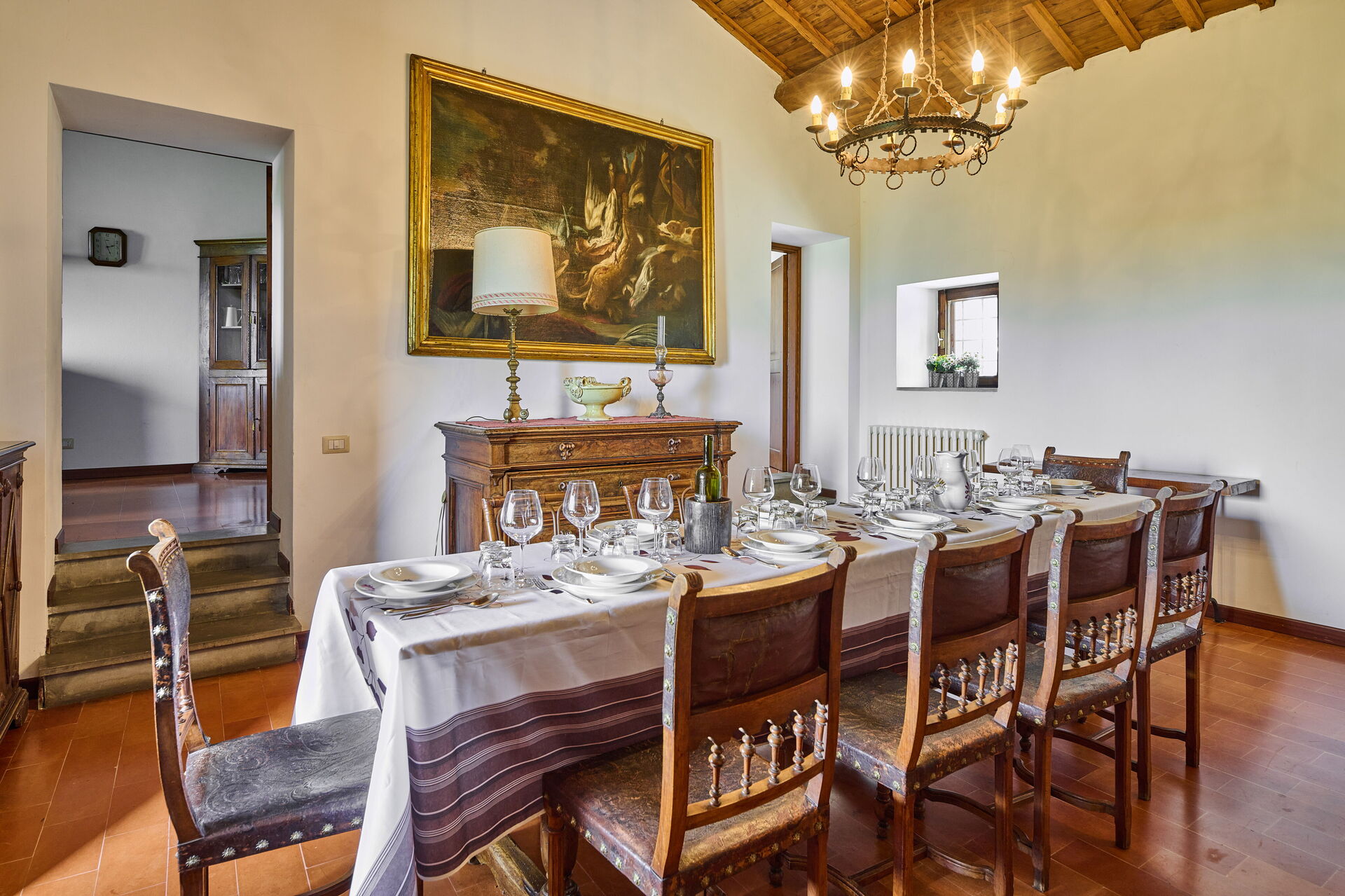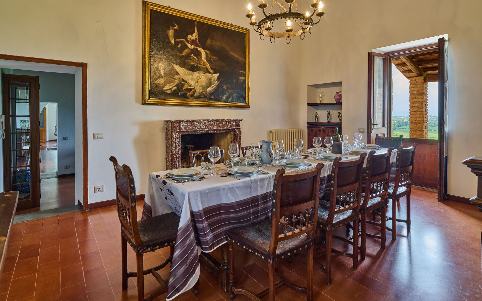 Eetkamer (15 m2): eettafel (personen: 10), WIFI internet, hor, open haard, uitgang naar het terras.