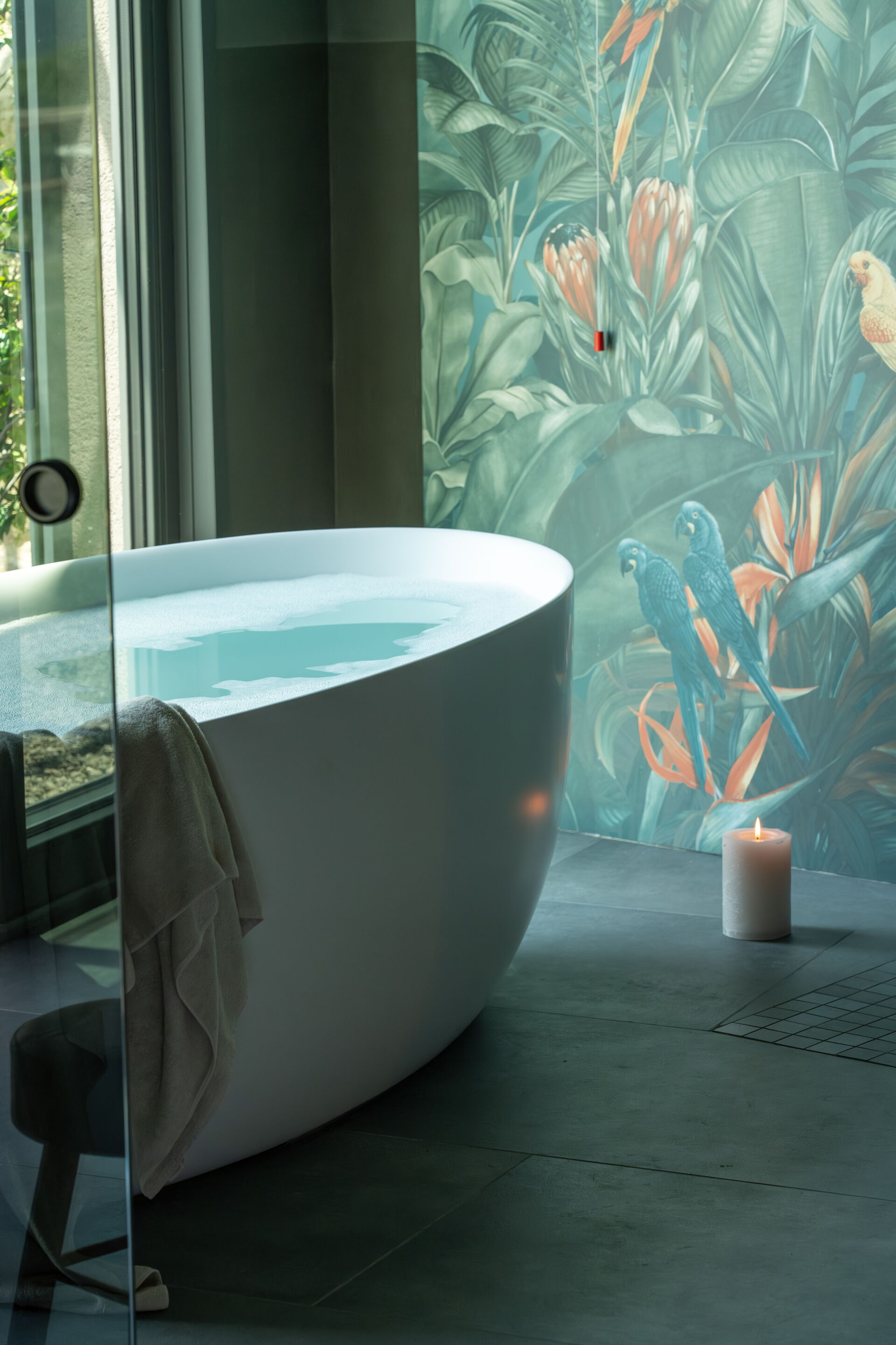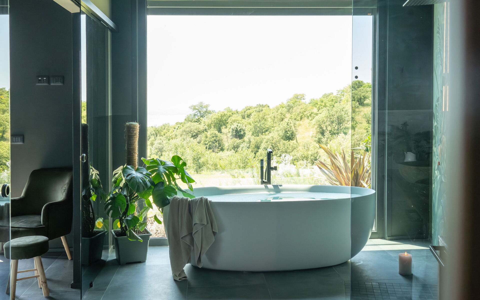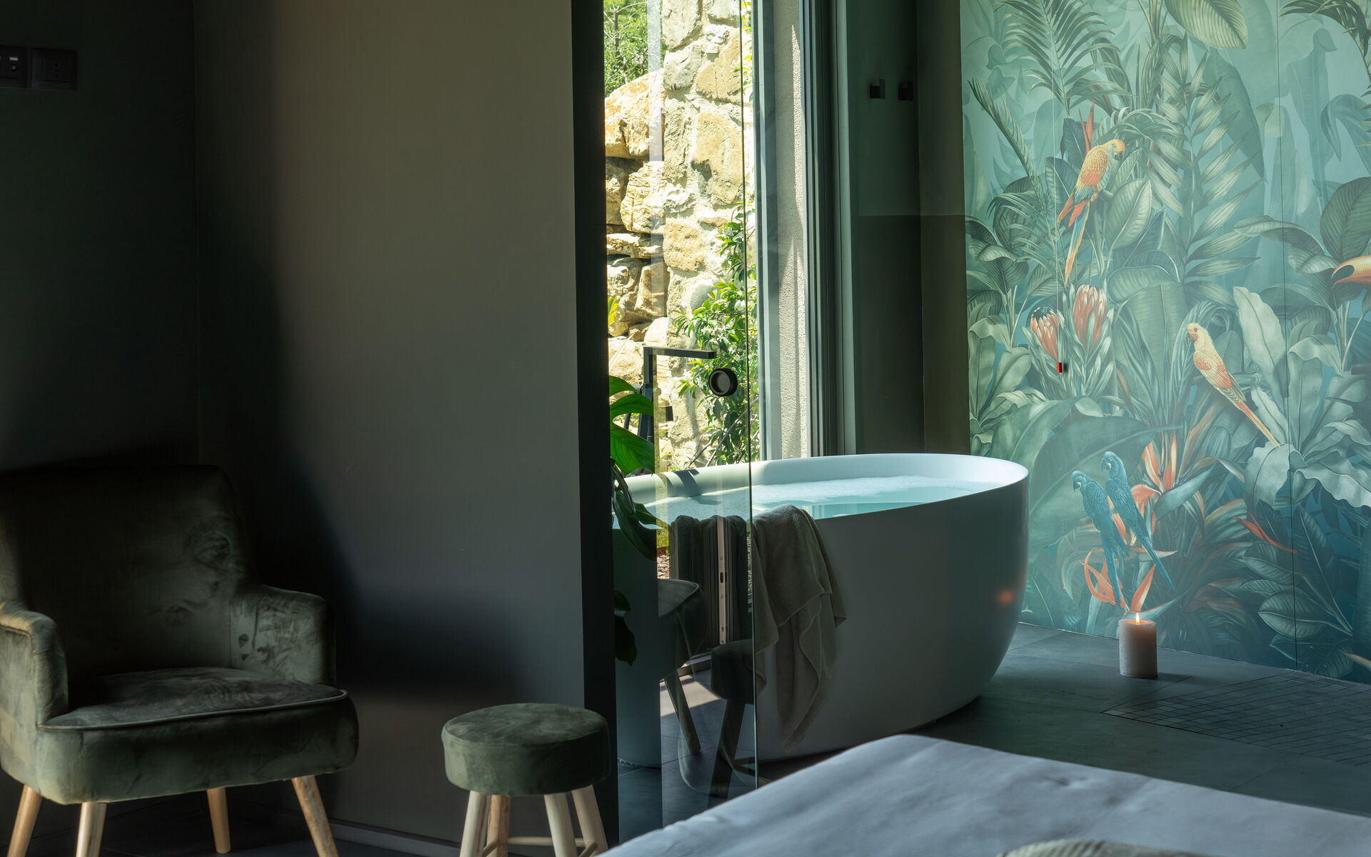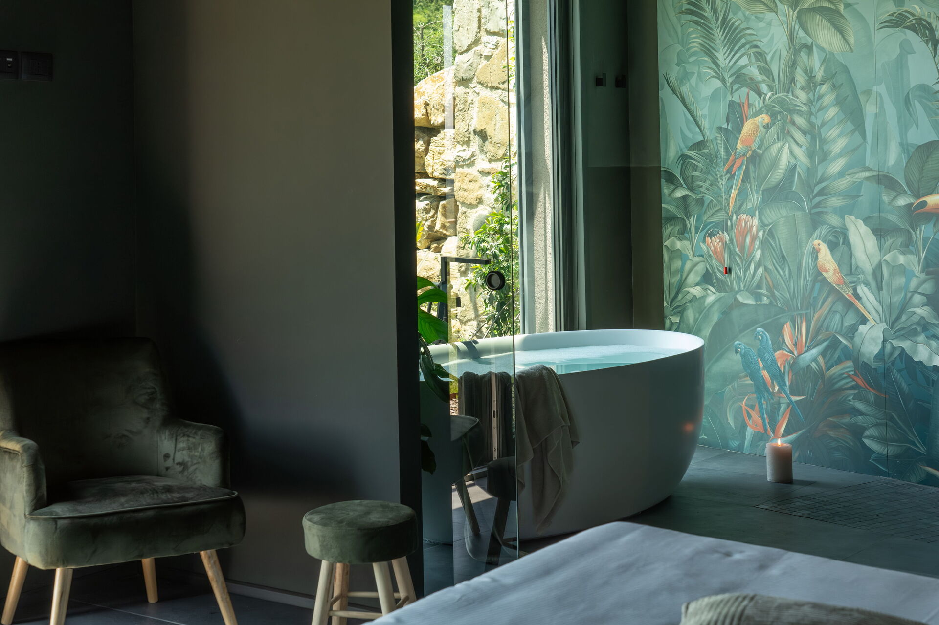 Slaapkamer met badkamer 3: tweepersoonsbed, WIFI internet, airconditioning, fauteuil, bureau, wastafel, toilet , bidet, bad, douche, haardroger, uitgang naar de tuin.