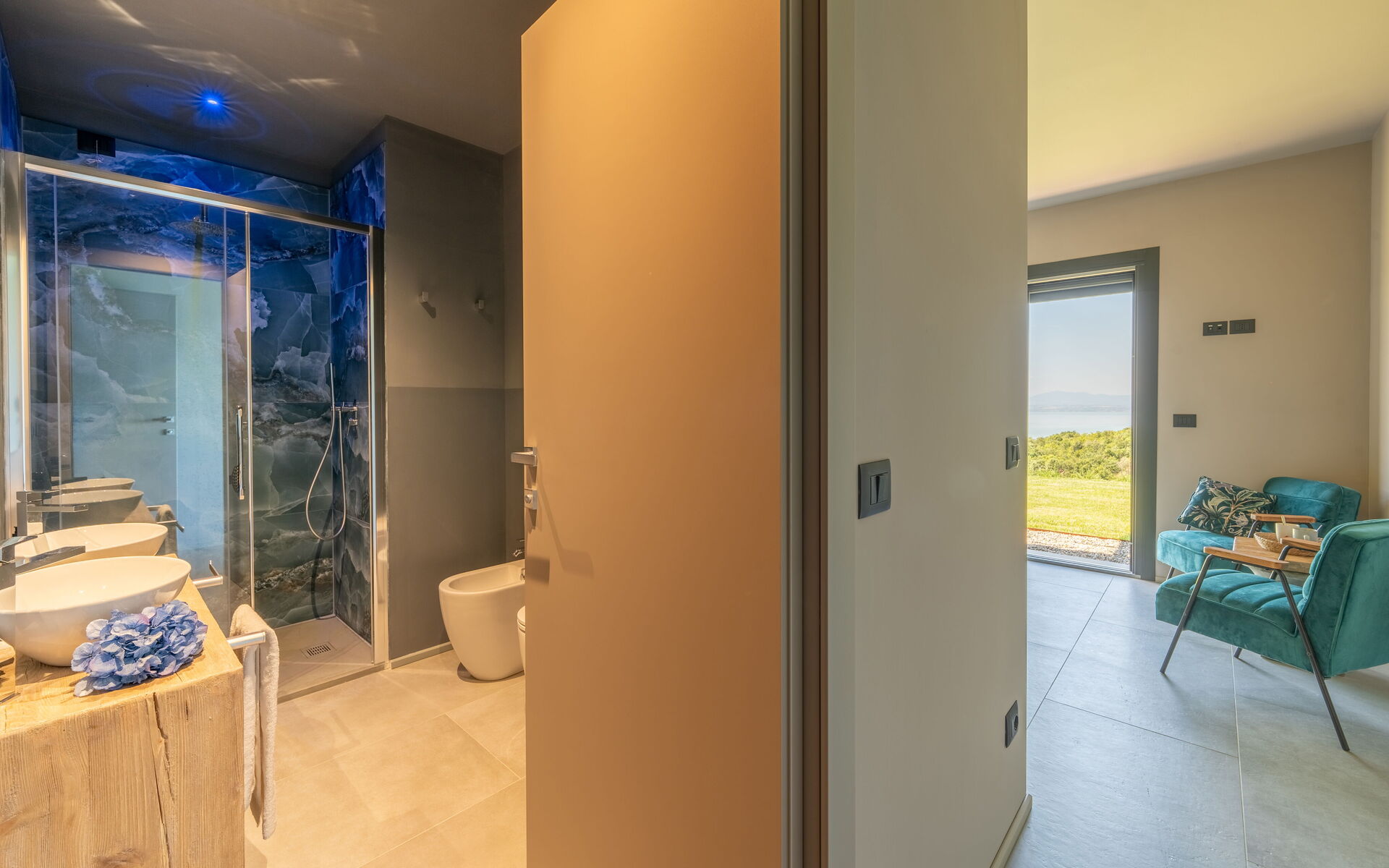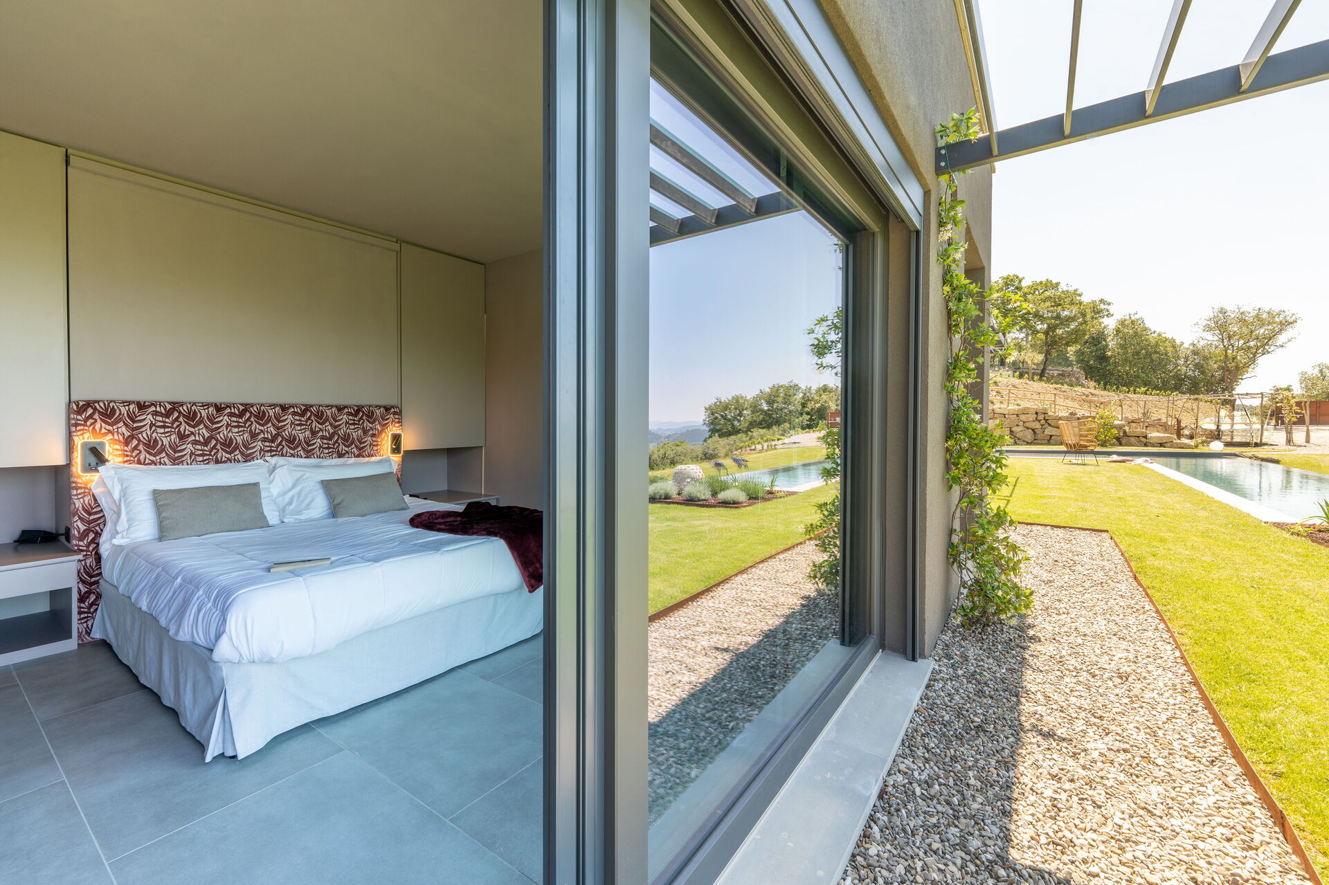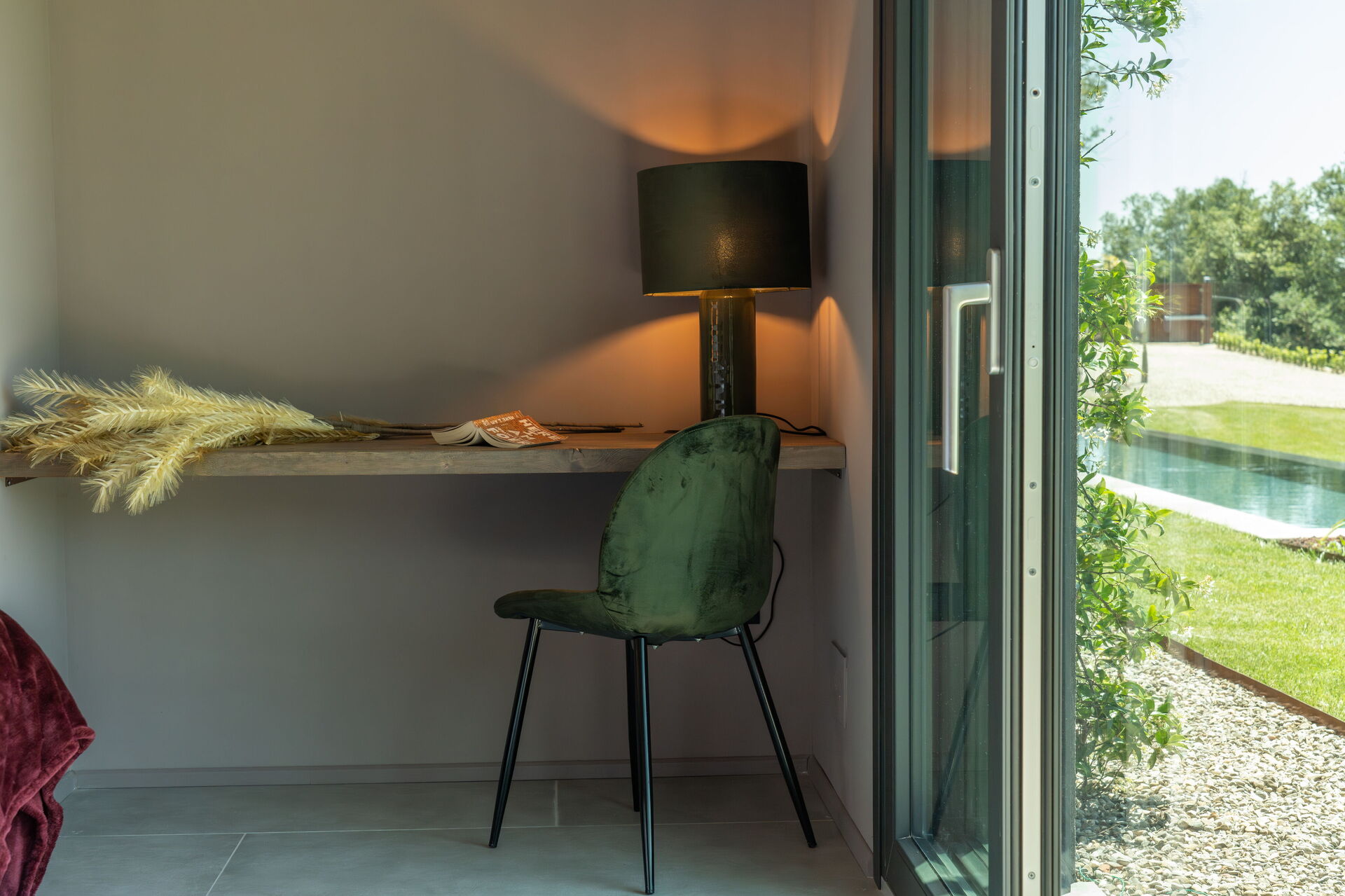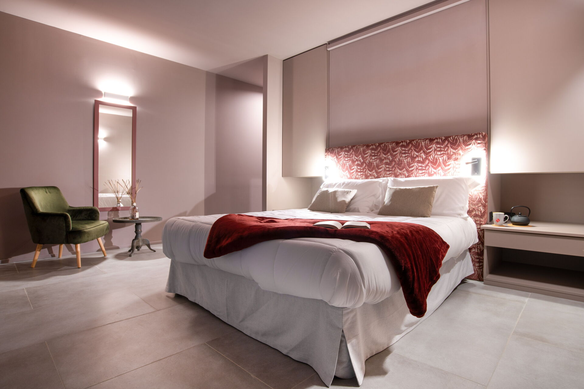 Slaapkamer met badkamer 2: tweepersoonsbed, WIFI internet, airconditioning, fauteuil, bureau, wastafel, toilet , bidet, douche, haardroger, uitgang naar de tuin.