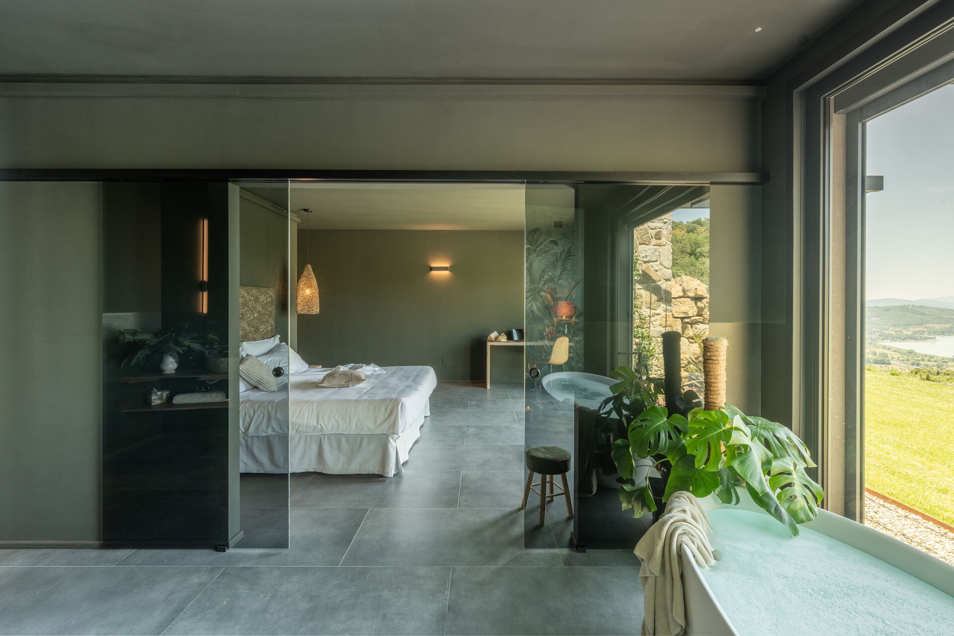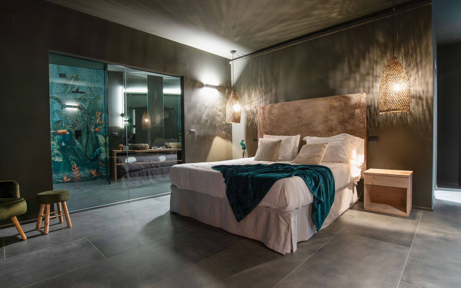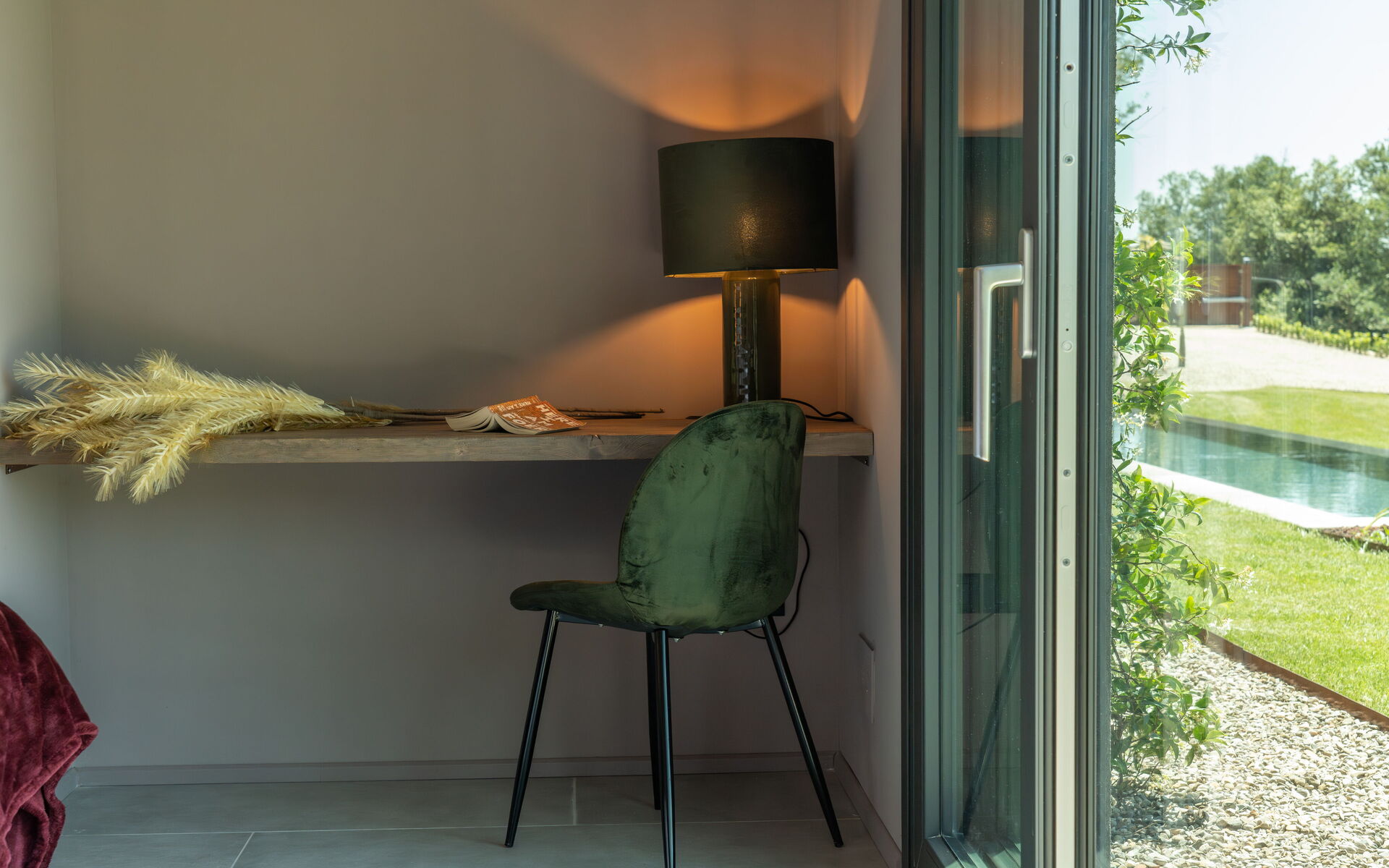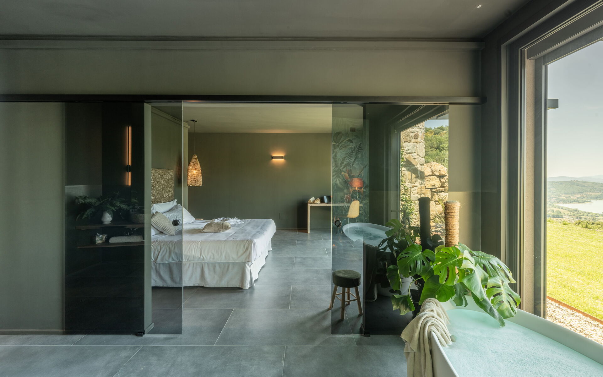 Slaapkamer met badkamer 2: tweepersoonsbed, WIFI internet, airconditioning, fauteuil, bureau, wastafel, toilet , bidet, douche, haardroger, uitgang naar de tuin.
