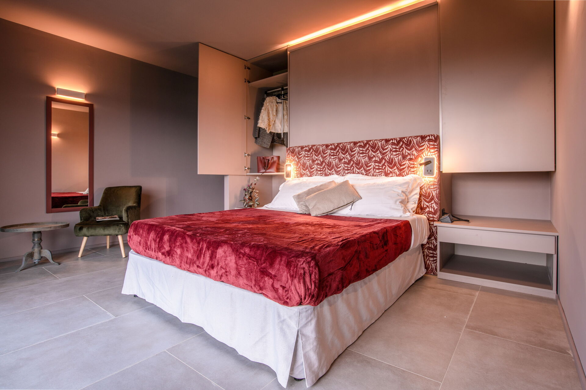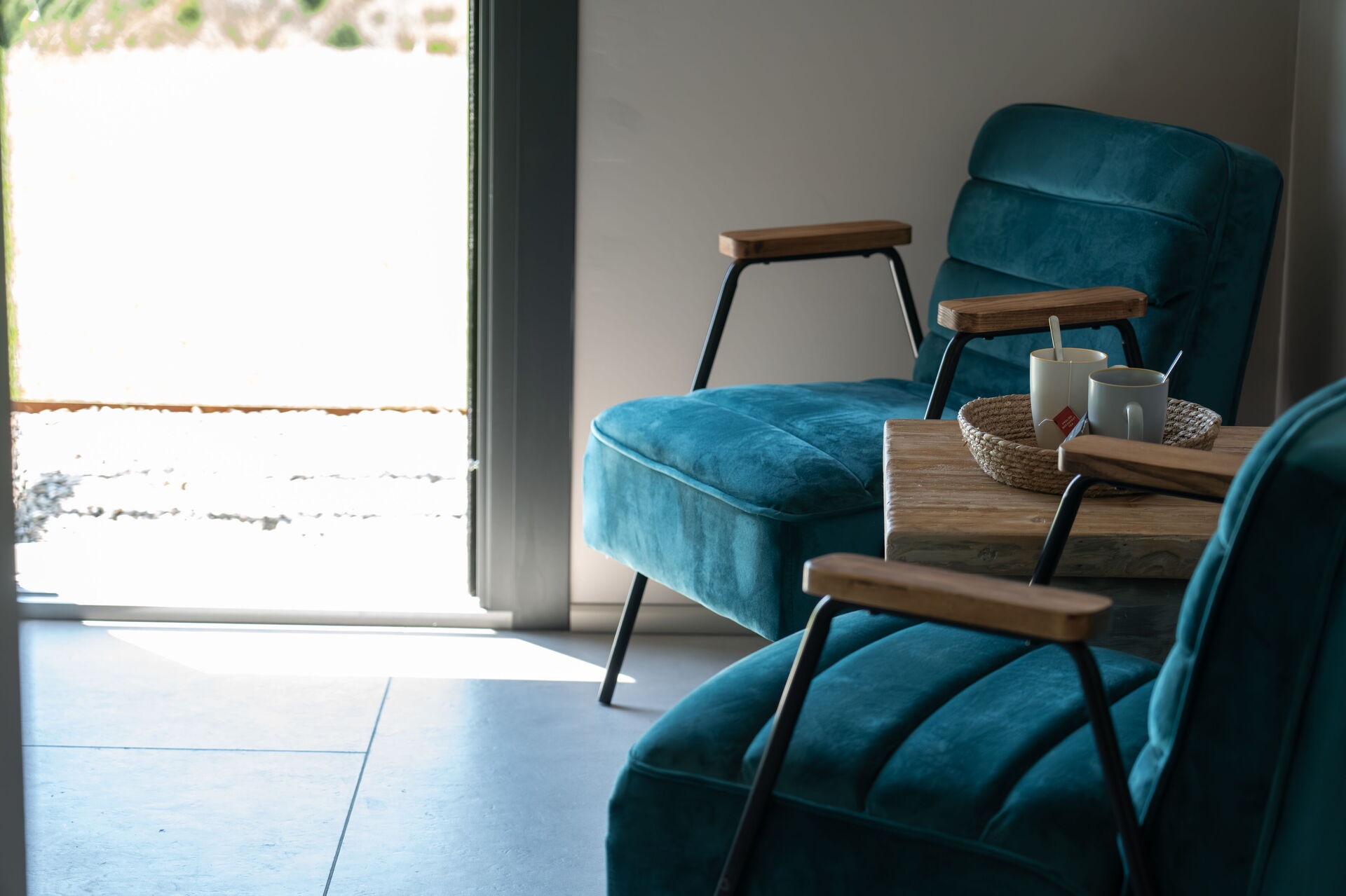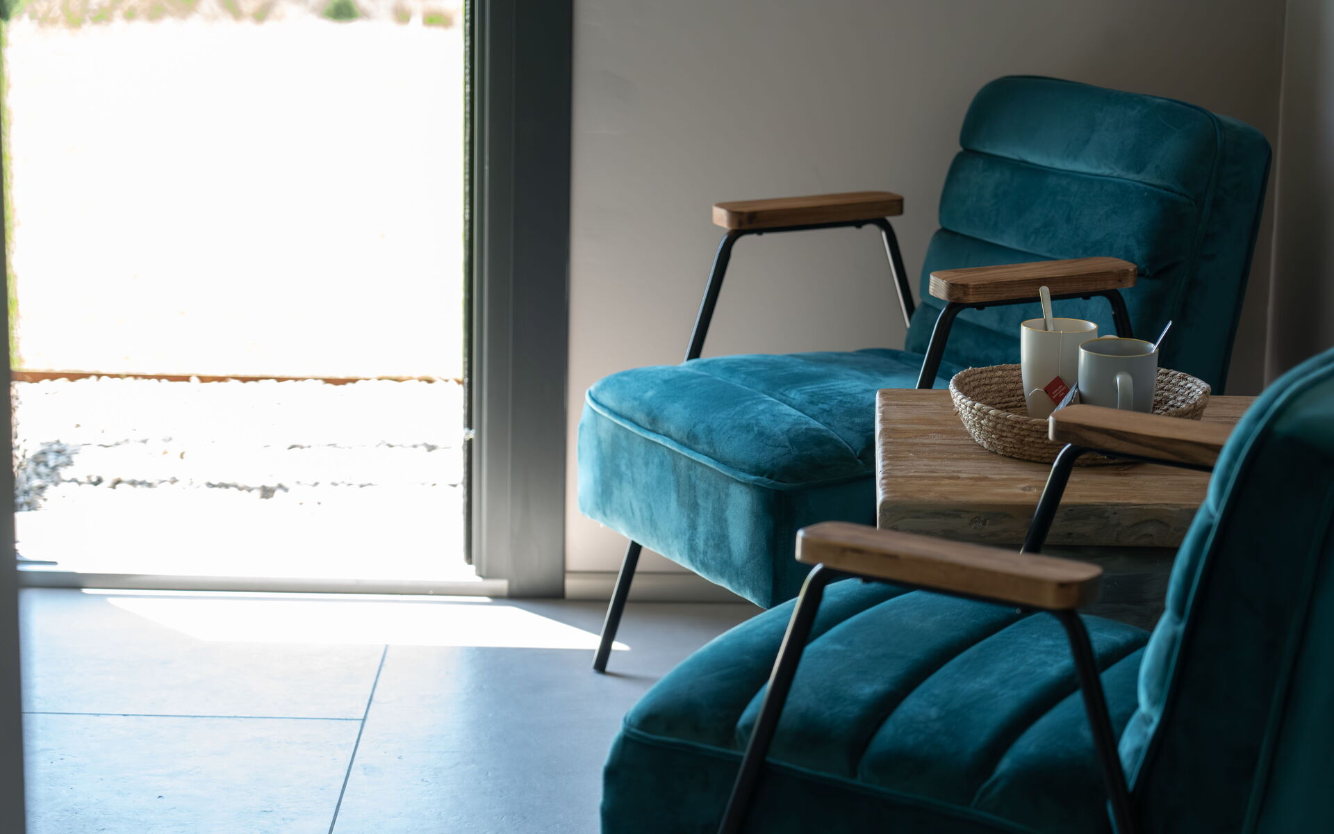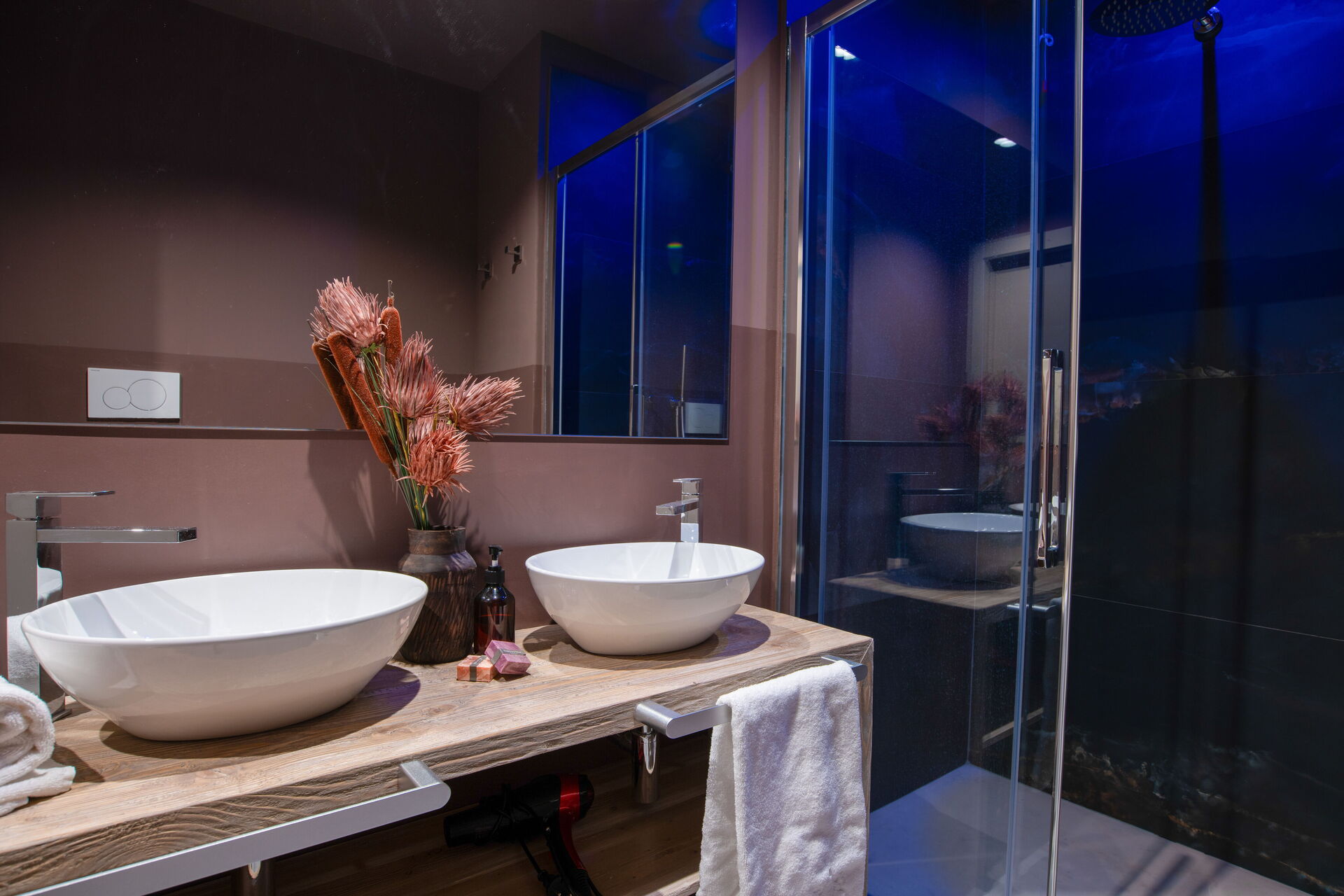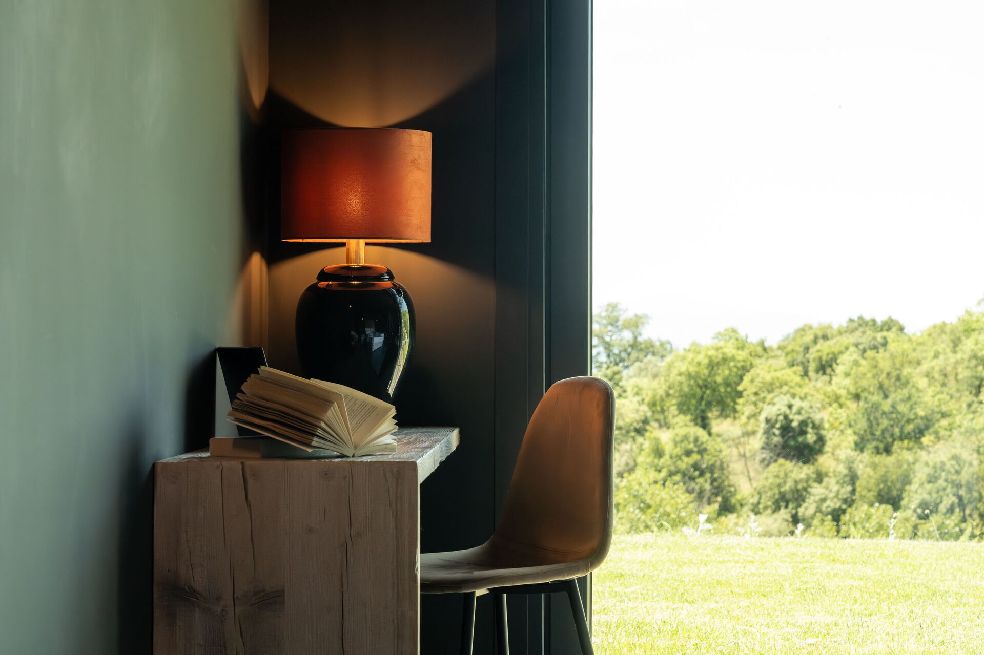 Slaapkamer met badkamer 2: tweepersoonsbed, WIFI internet, airconditioning, fauteuil, bureau, wastafel, toilet , bidet, douche, haardroger, uitgang naar de tuin.