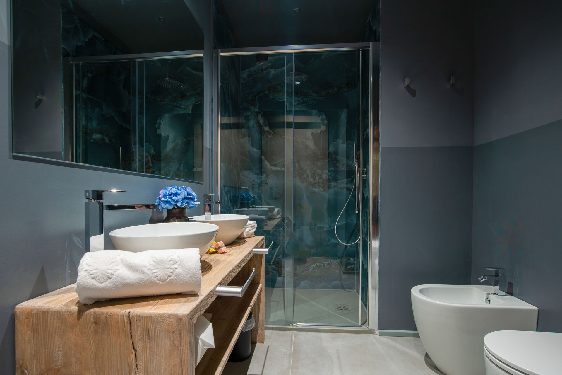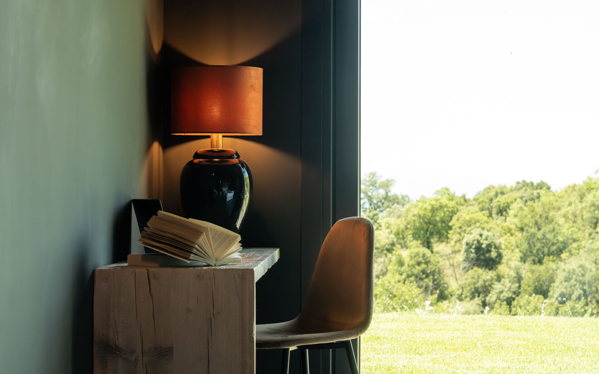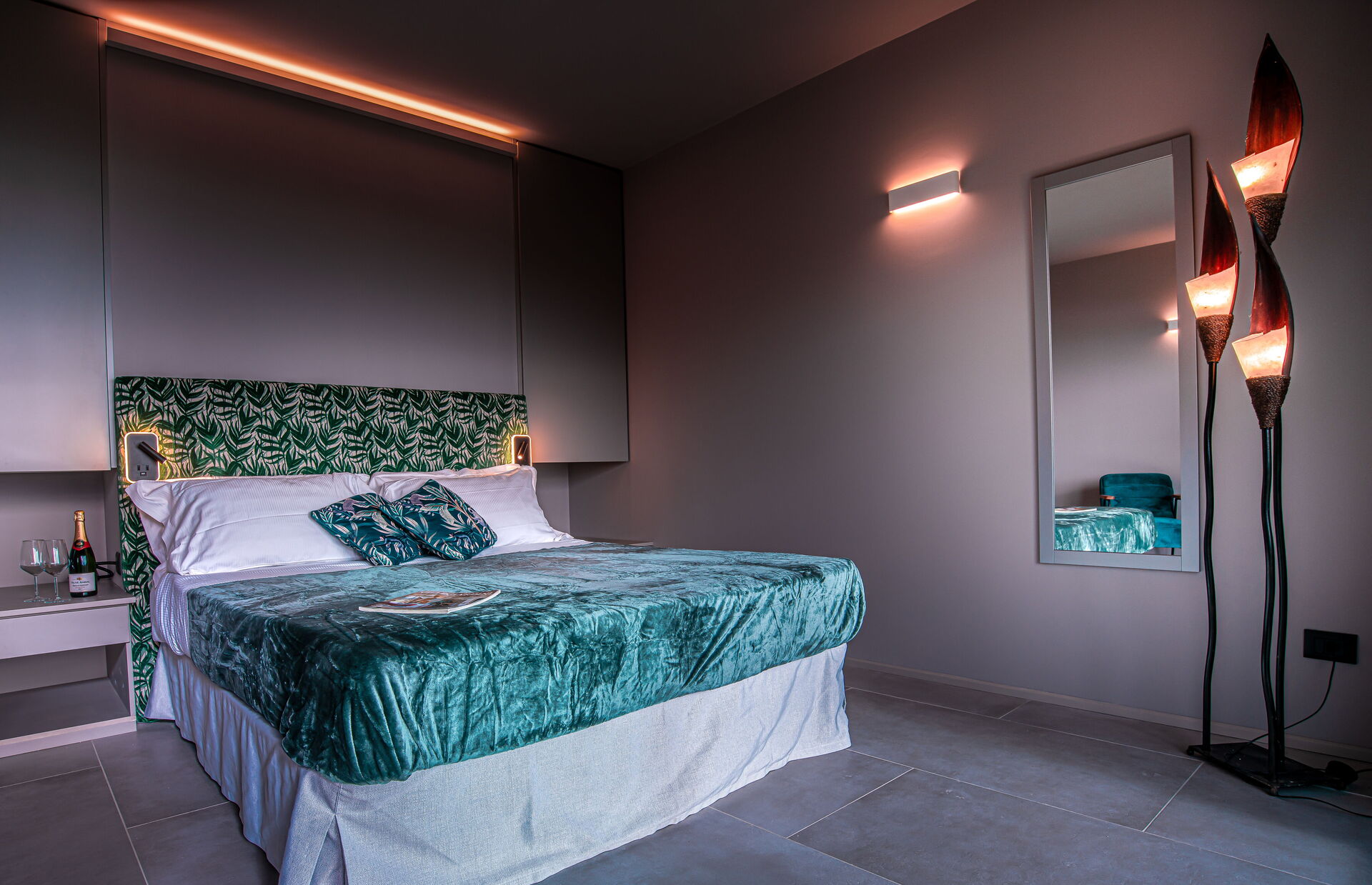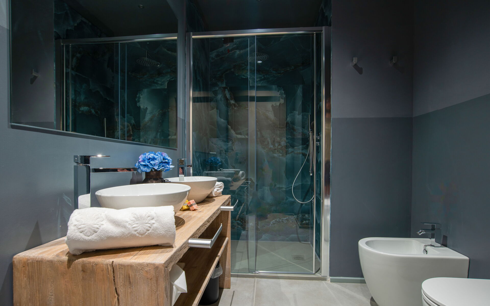 Slaapkamer met badkamer 2: tweepersoonsbed, WIFI internet, airconditioning, fauteuil, bureau, wastafel, toilet , bidet, douche, haardroger, uitgang naar de tuin.