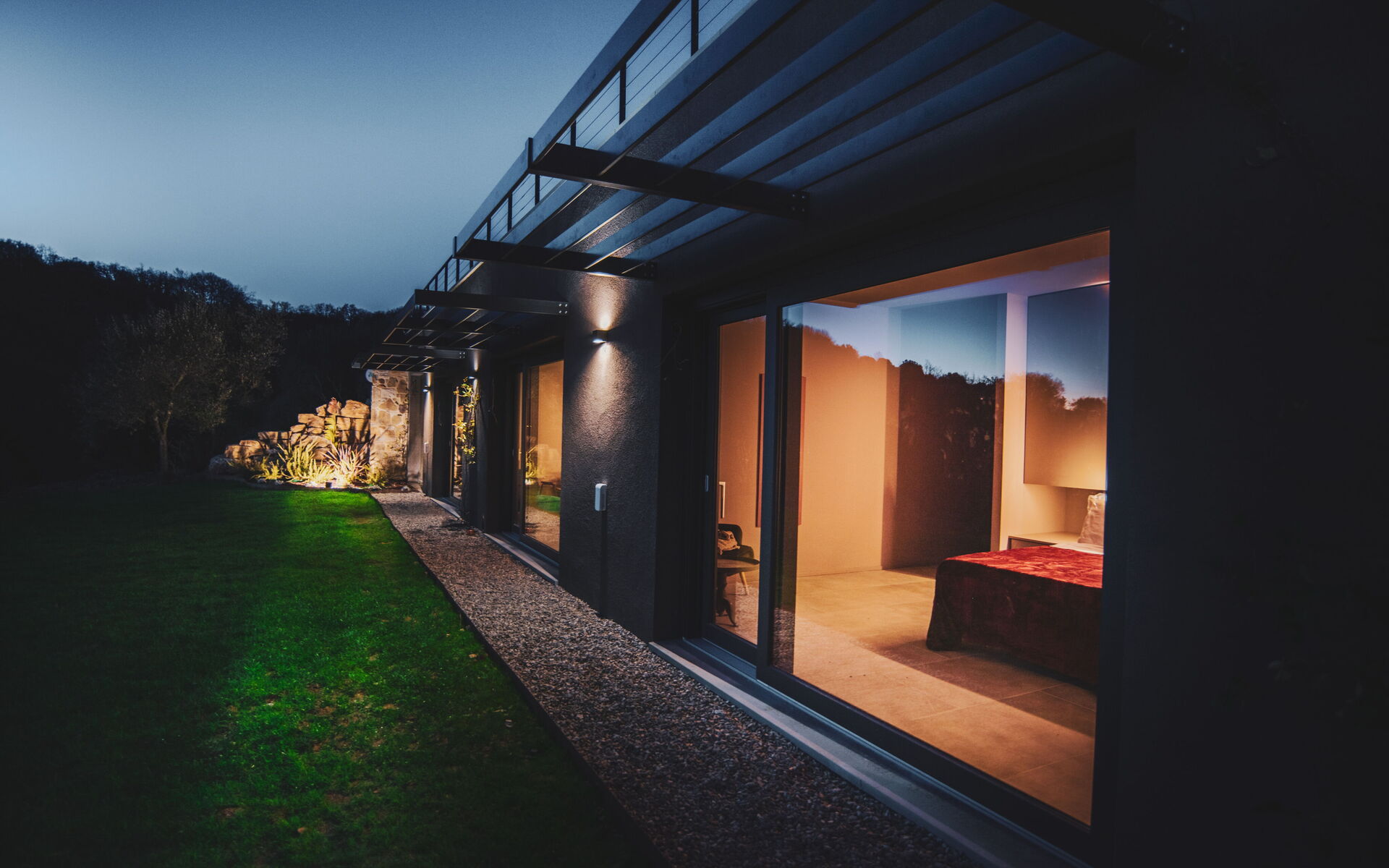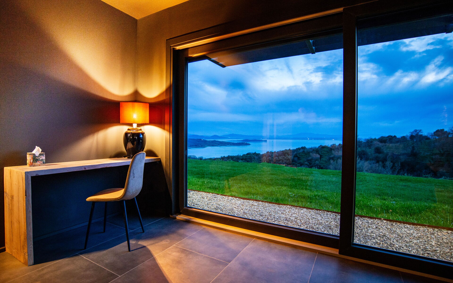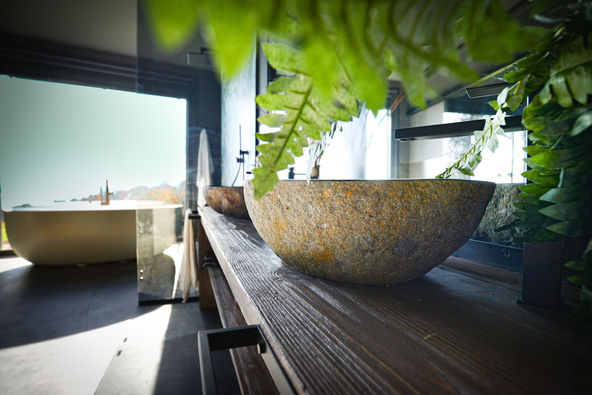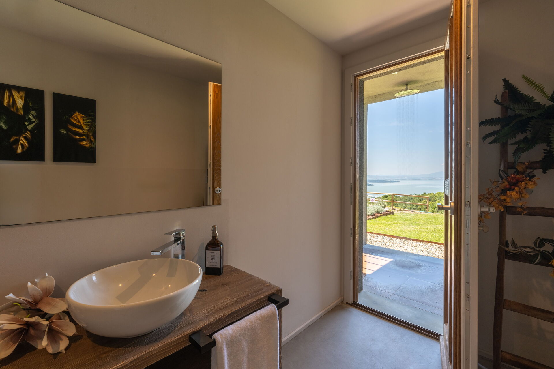 Slaapkamer met badkamer 2: tweepersoonsbed, WIFI internet, airconditioning, fauteuil, bureau, wastafel, toilet , bidet, douche, haardroger, uitgang naar de tuin.