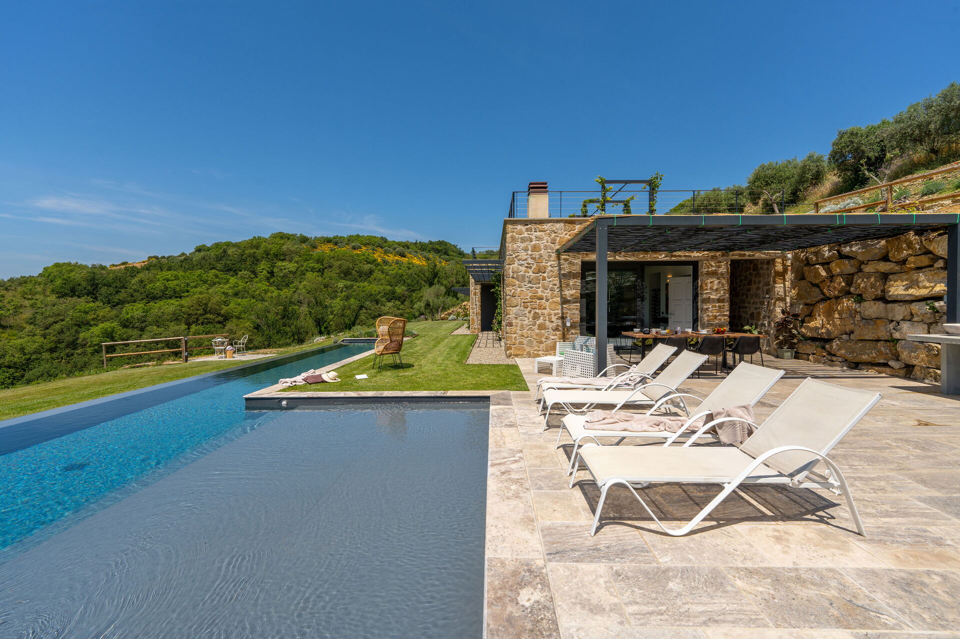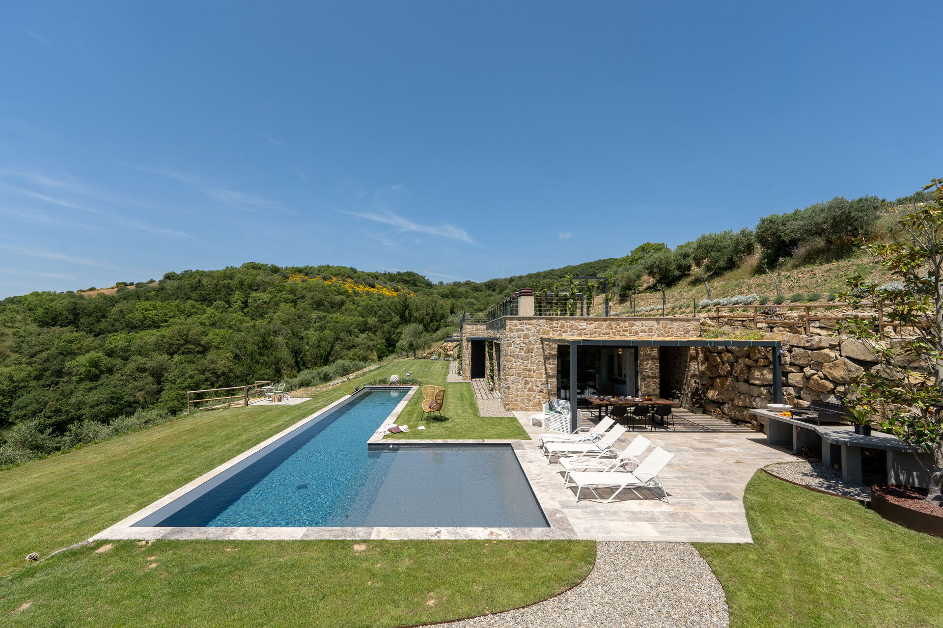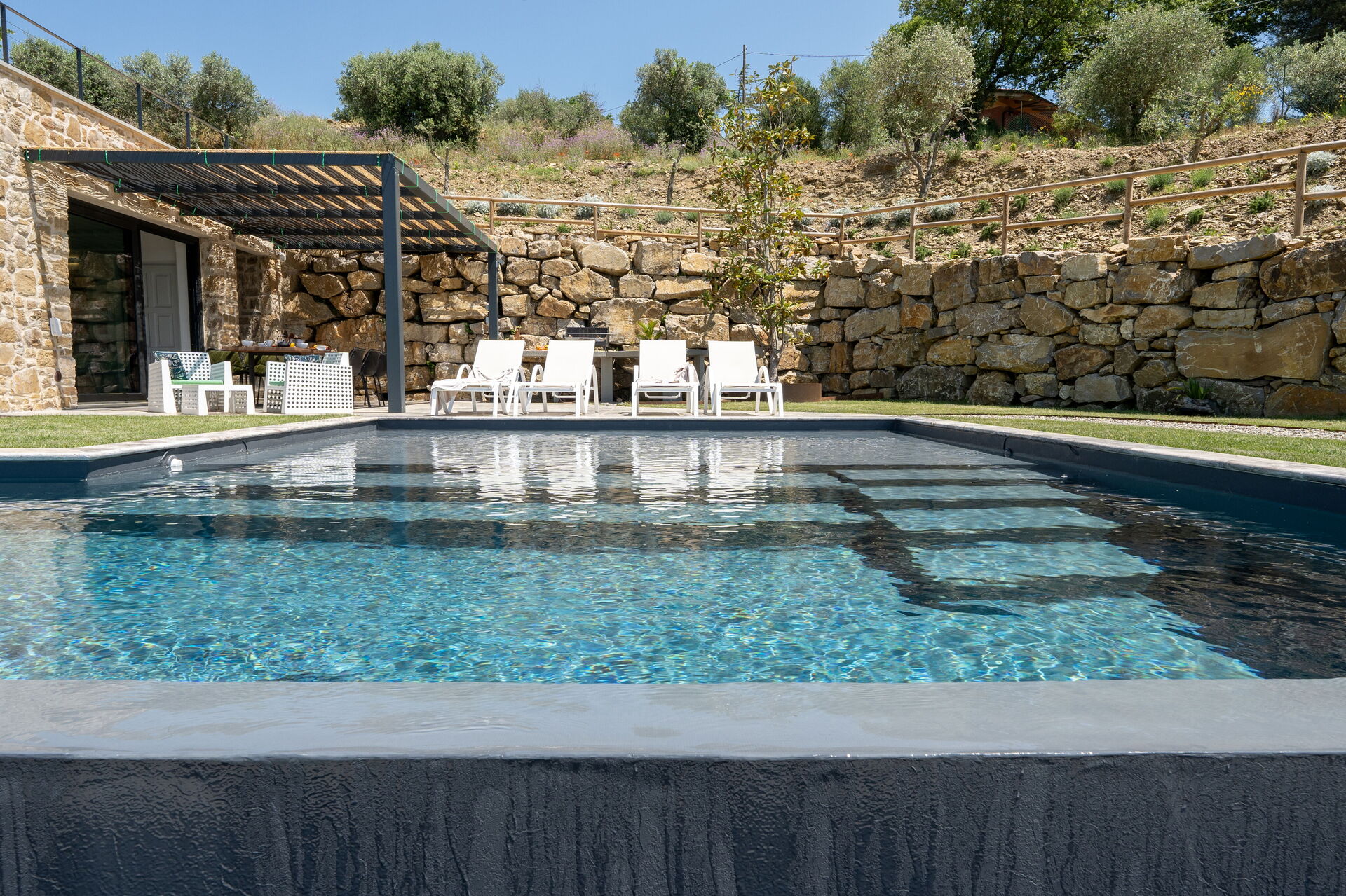 Tuin: zwembad (privé, breedte: 16.5m, lengte: 2.7m, diepte: 1.5m, buiten, verwarmd), douche, WIFI internet, barbecue, dineren in de buitenlucht, eettafel (personen: 10), tuinmeubilair, ligstoel, omheind grondstuk.
