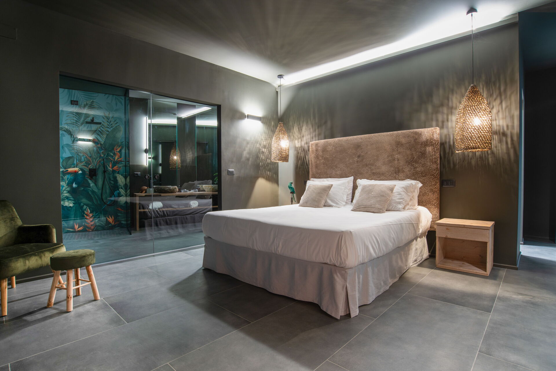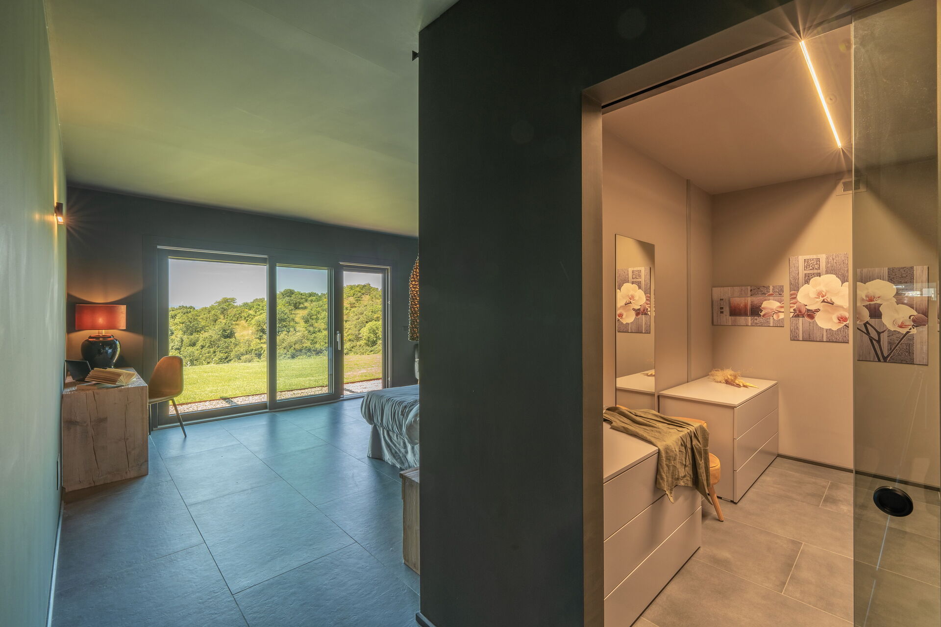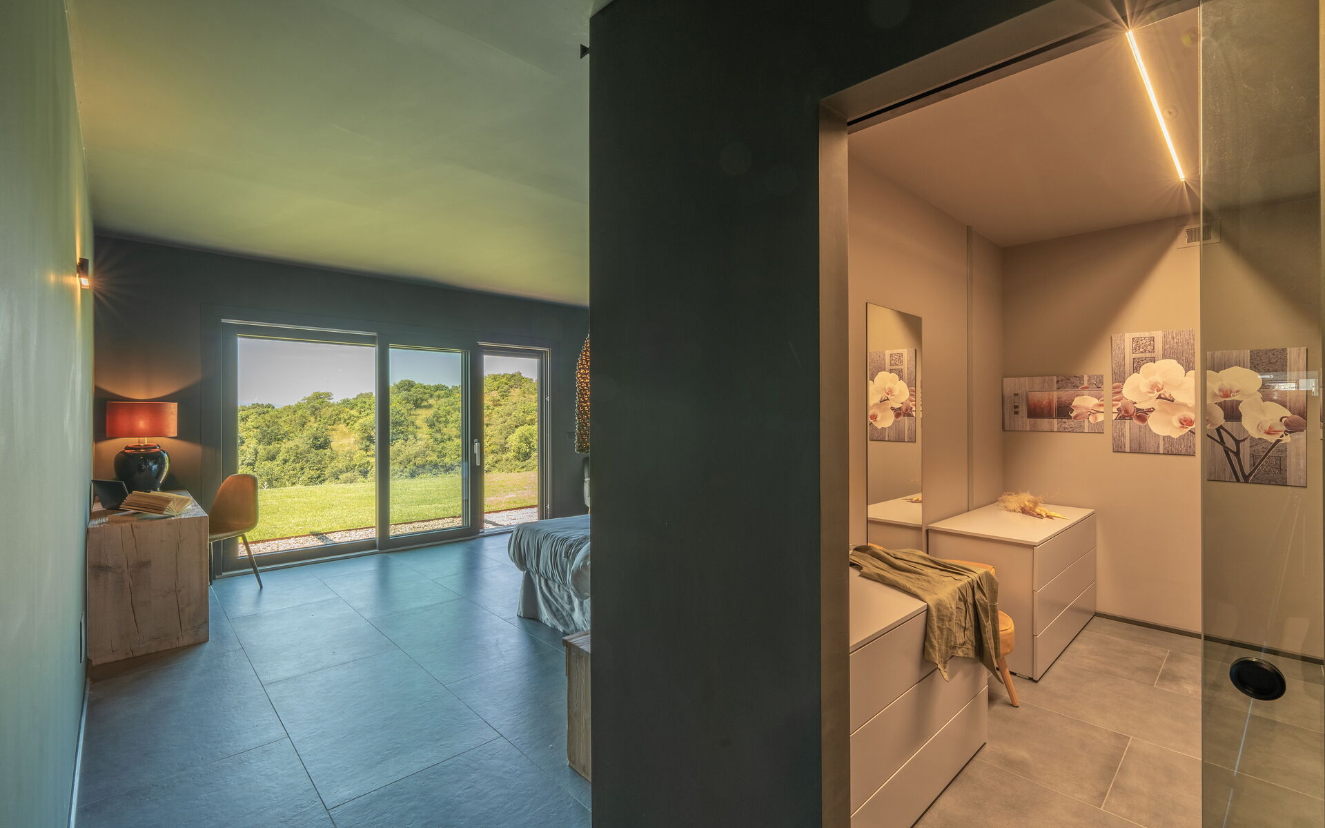 Slaapkamer met badkamer 1: tweepersoonsbed, WIFI internet, airconditioning, fauteuil, bureau, wastafel, toilet , bidet, douche, haardroger, wasdroger, wasmachine, uitgang naar de tuin.