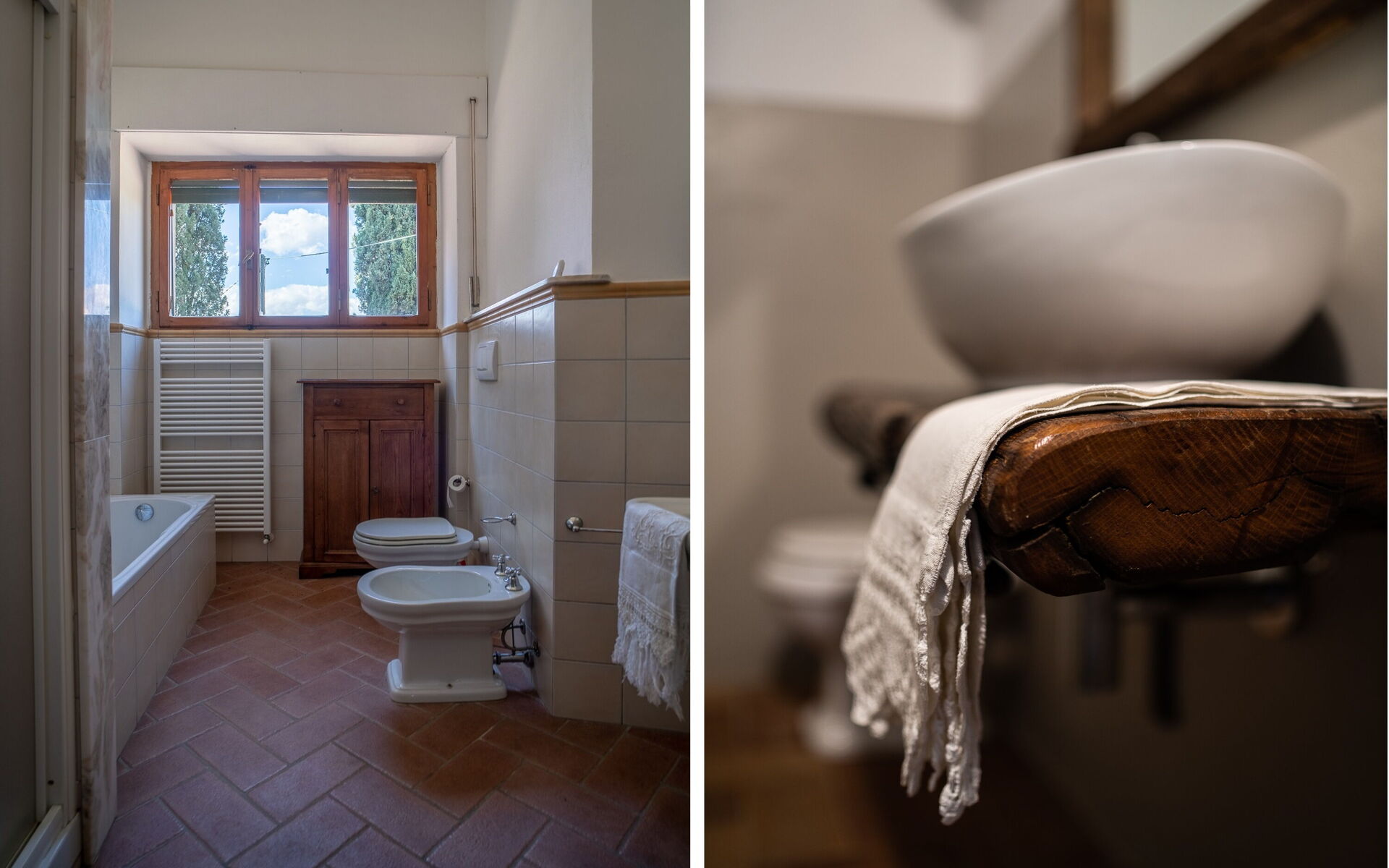 Badkamer 1: wastafel, toilet , bidet, bad, douche.